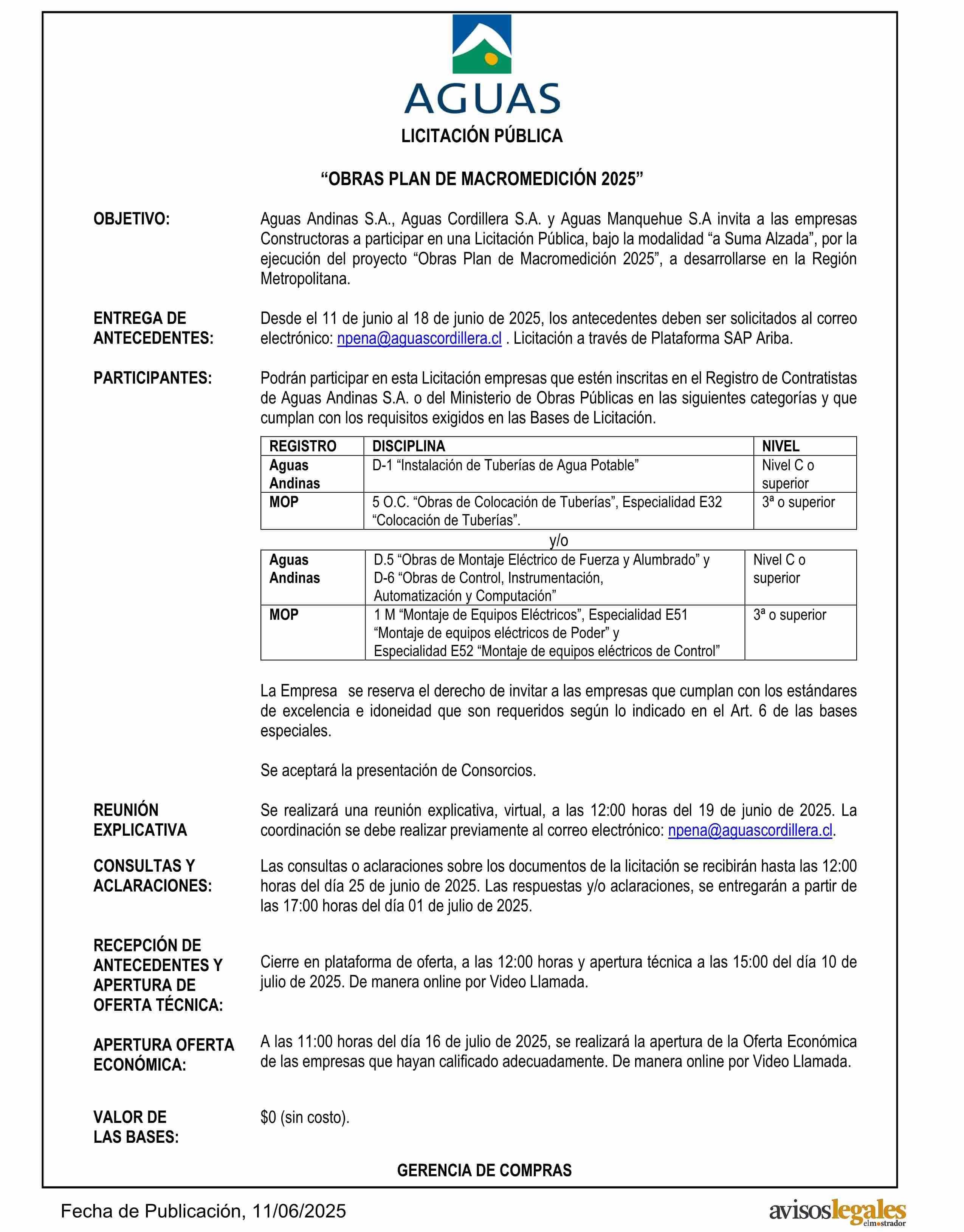 AVISO LICITACIONES: “OBRAS PLAN DE MACROMEDICIÓN 2025” 12-06-2025 El Mostrador - Avisos Legales |
