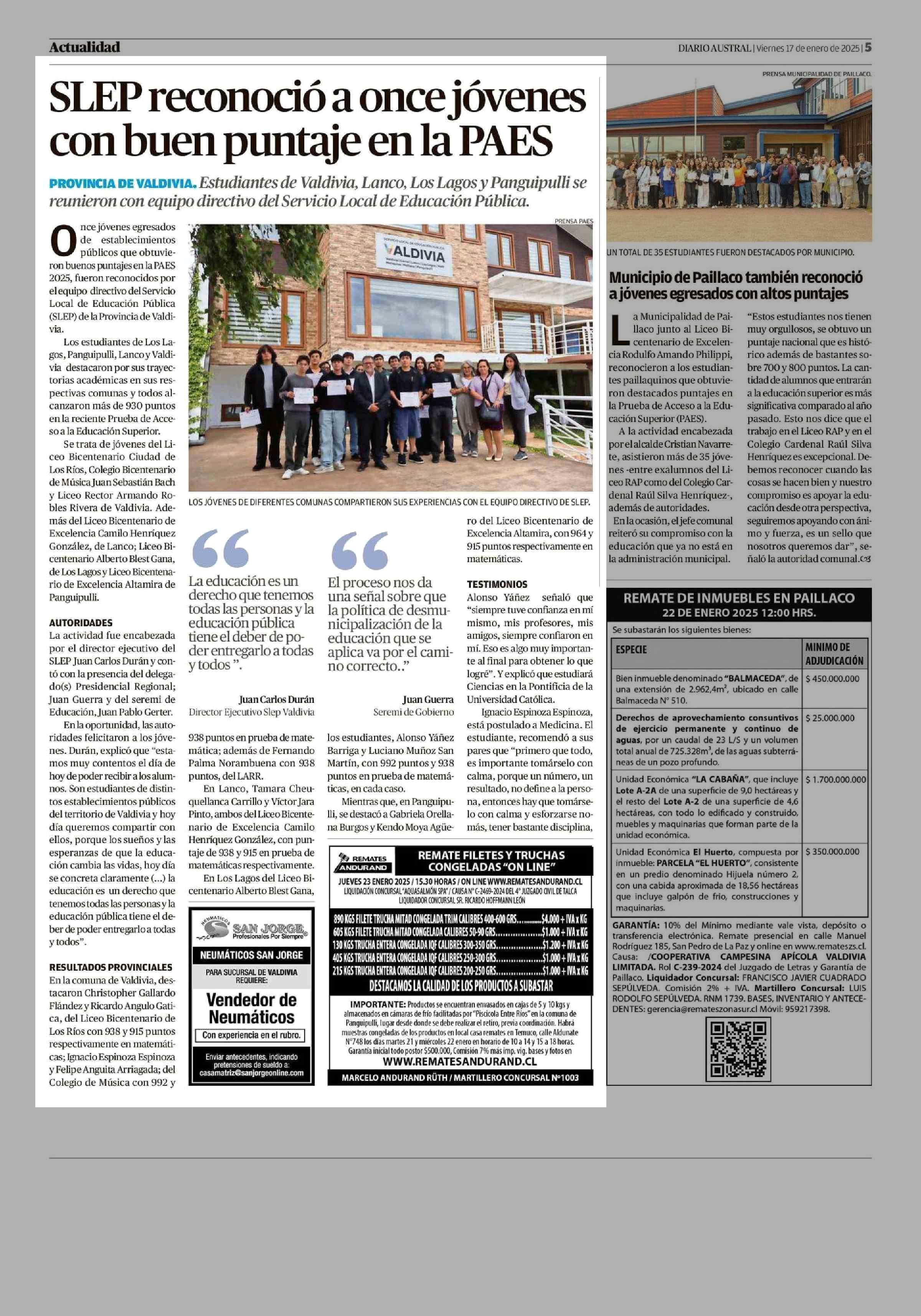 SLEP reconoció a once jóvenes con buen puntaje en la PAES 17-01-2025 Diario Austral Región de Los Ríos |