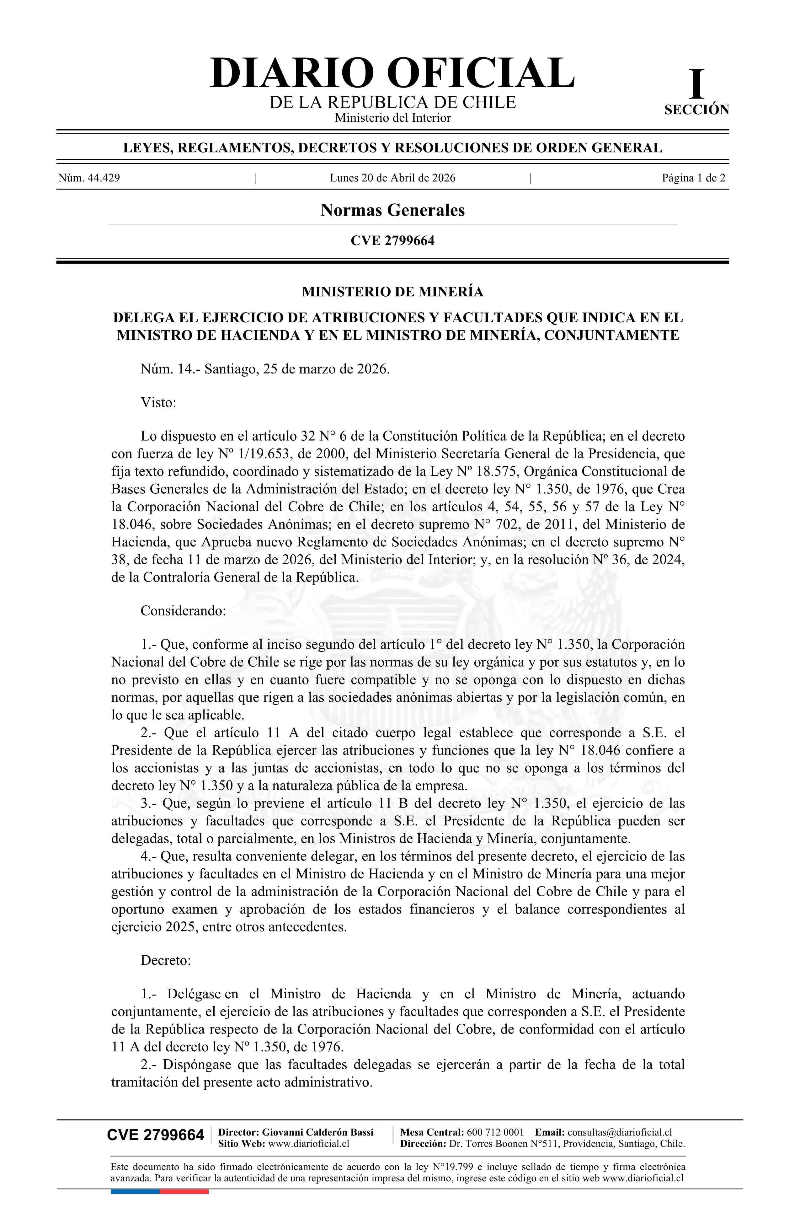 Decreto número 14, de 2026.- Delega el ejercicio de atribuciones y facultades que indica en el Ministro de Hacienda y en el Ministro de Minería, conjuntamente 20-04-2026 Diario Oficial Edición Electrónica |