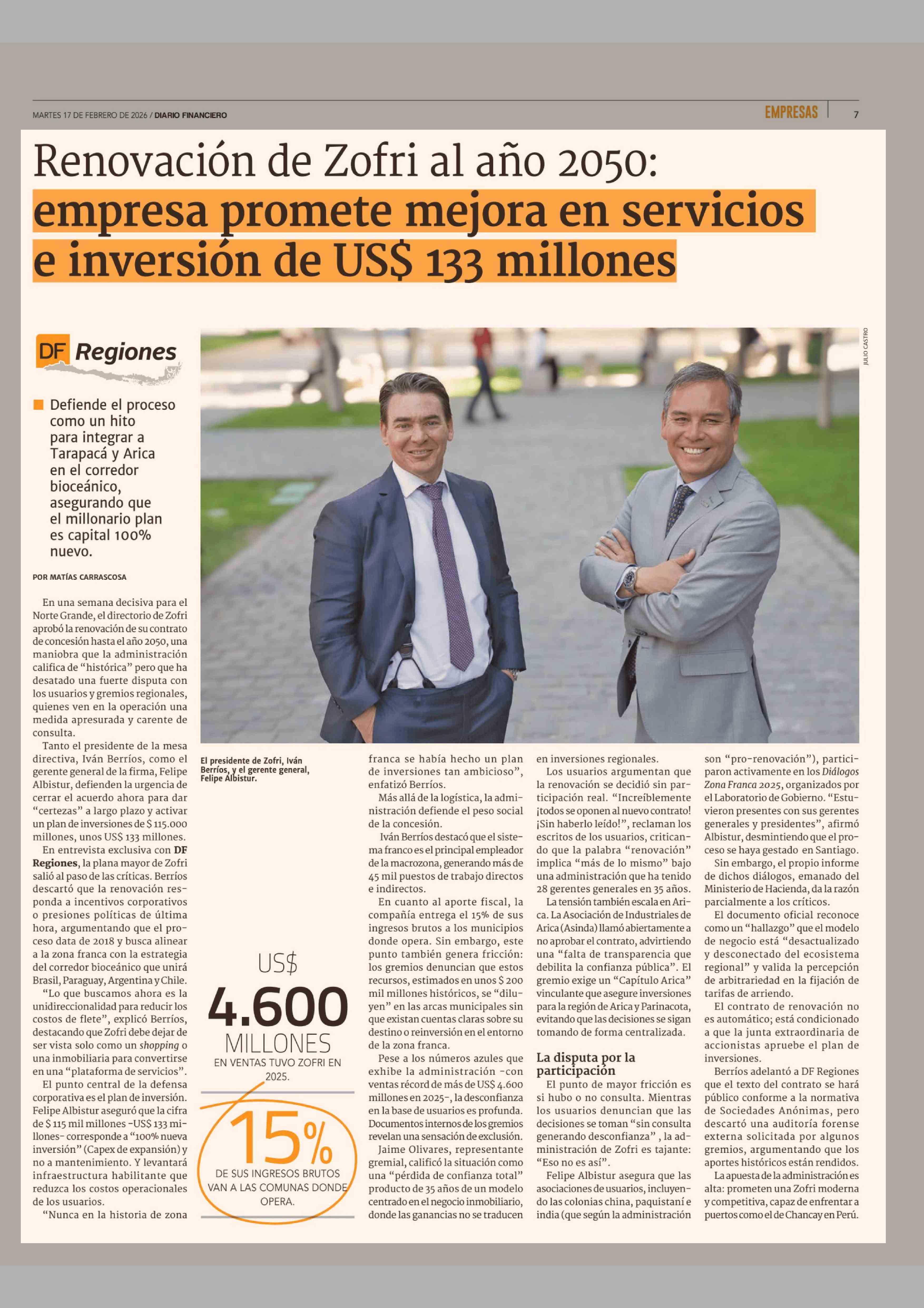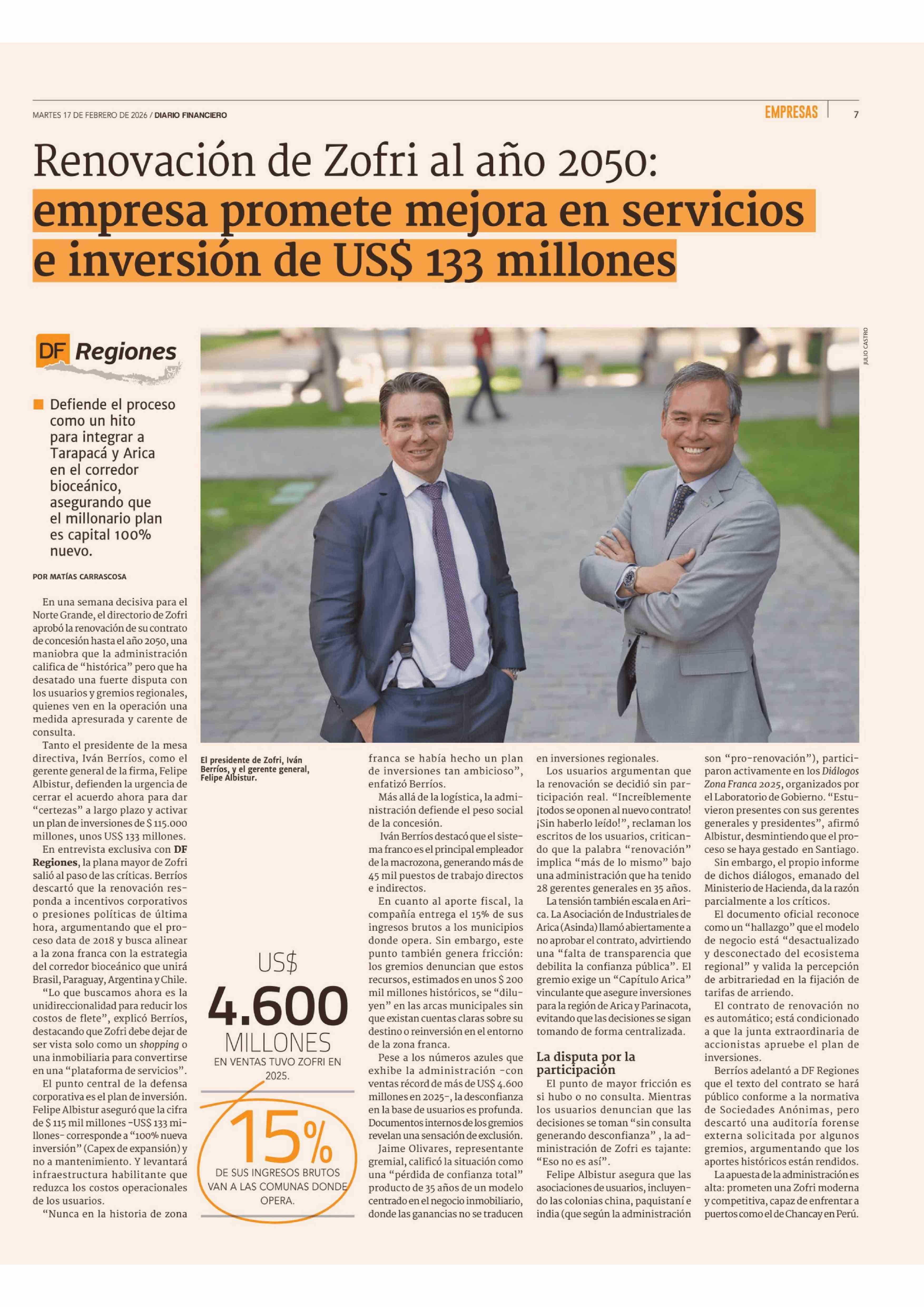 Renovación de Zofri al año 2050: empresa promete mejora en servicios e inversión de US$ 133 millones 17-02-2026 Diario Financiero |