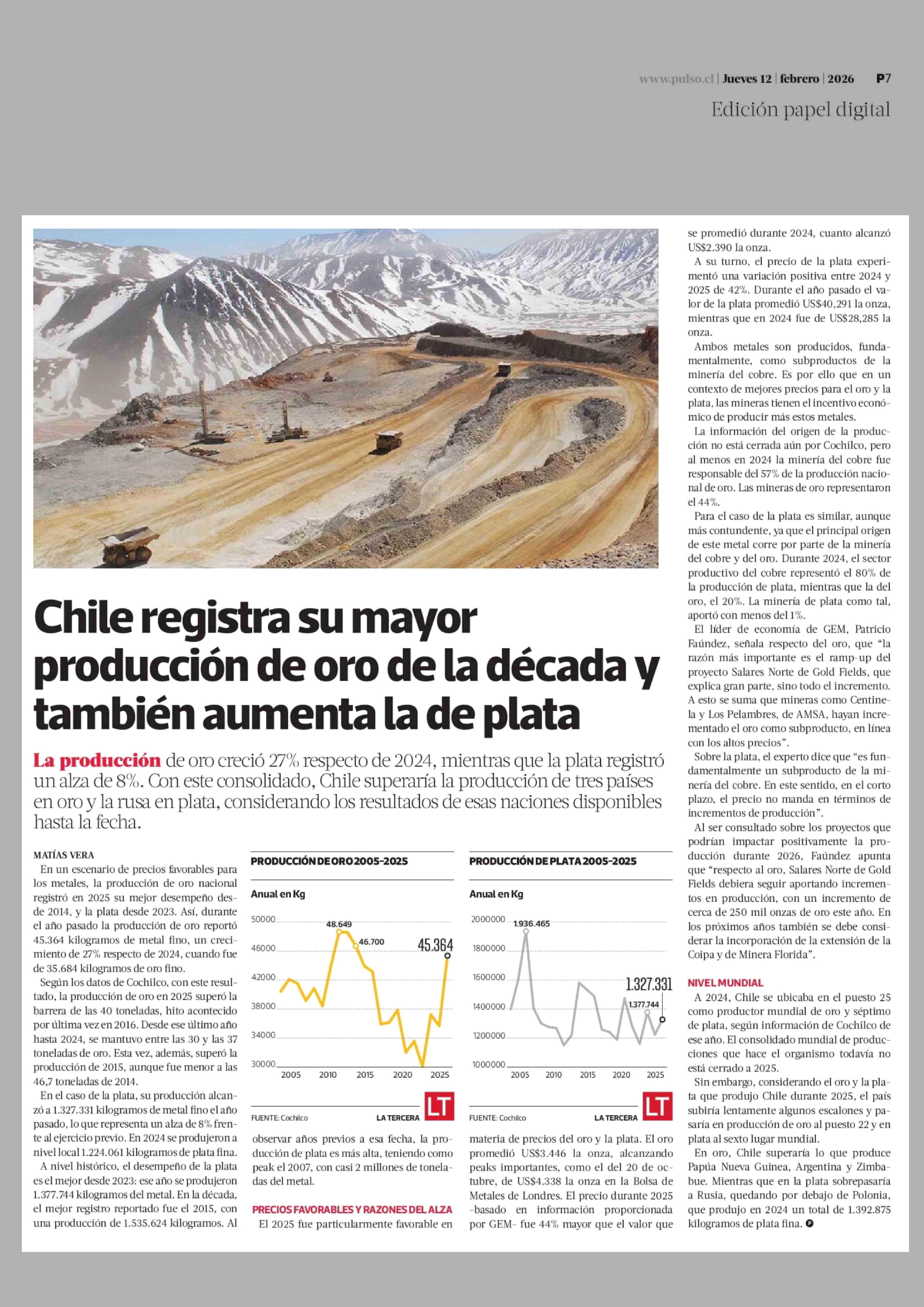 Chile registra su mayor producción de oro de la década y también aumenta la de plata 12-02-2026 La Tercera |