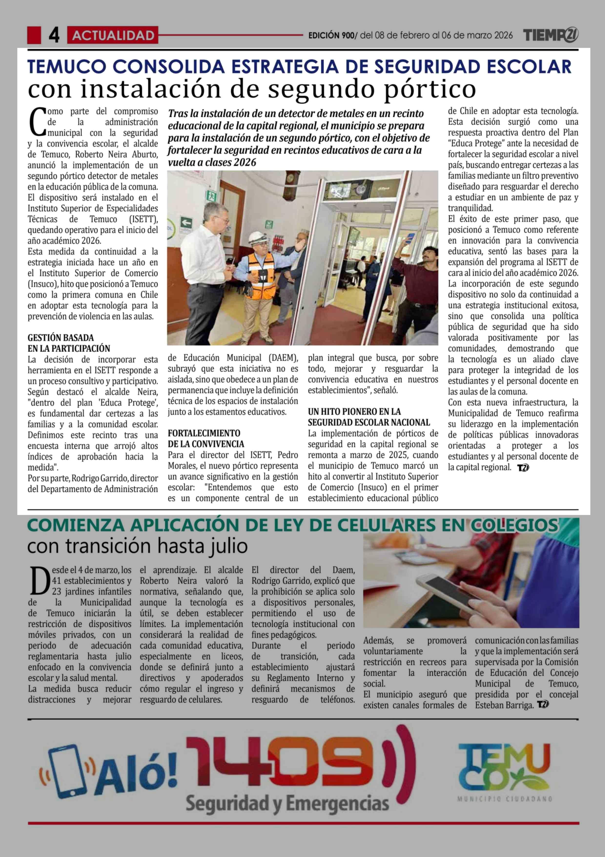 TEMUCO CONSOLIDA ESTRATEGIA DE SEGURIDAD ESCOLAR con instalación de segundo pórtico 28-02-2026 Tiempo 21 |