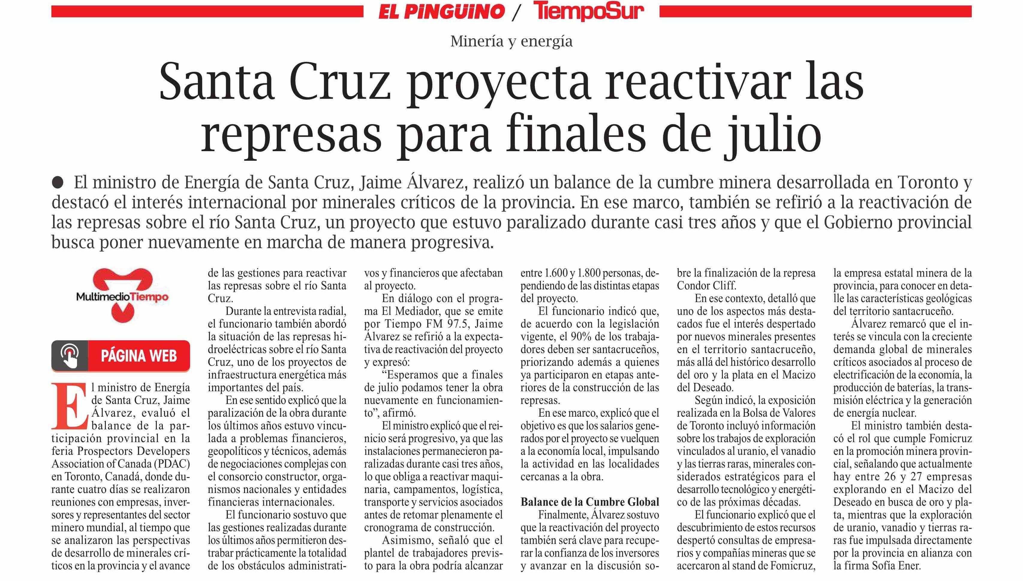 Santa Cruz proyecta reactivar las represas para finales de julio 07-03-2026 El Pingüino |
