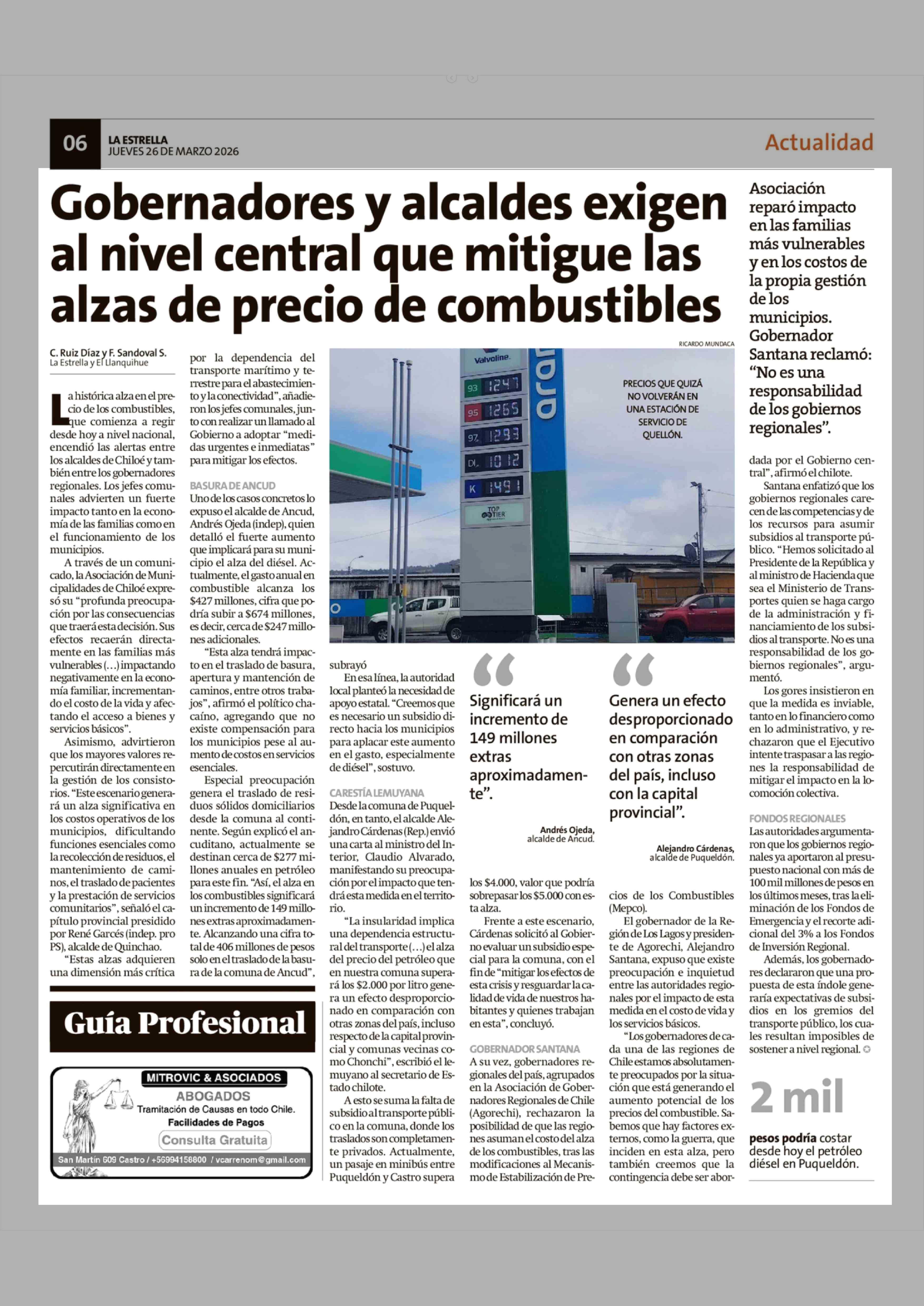 Gobernadores y alcaldes exigen al nivel central que mitigue las alzas de precio de combustibles 26-03-2026 La Estrella de Chiloé |