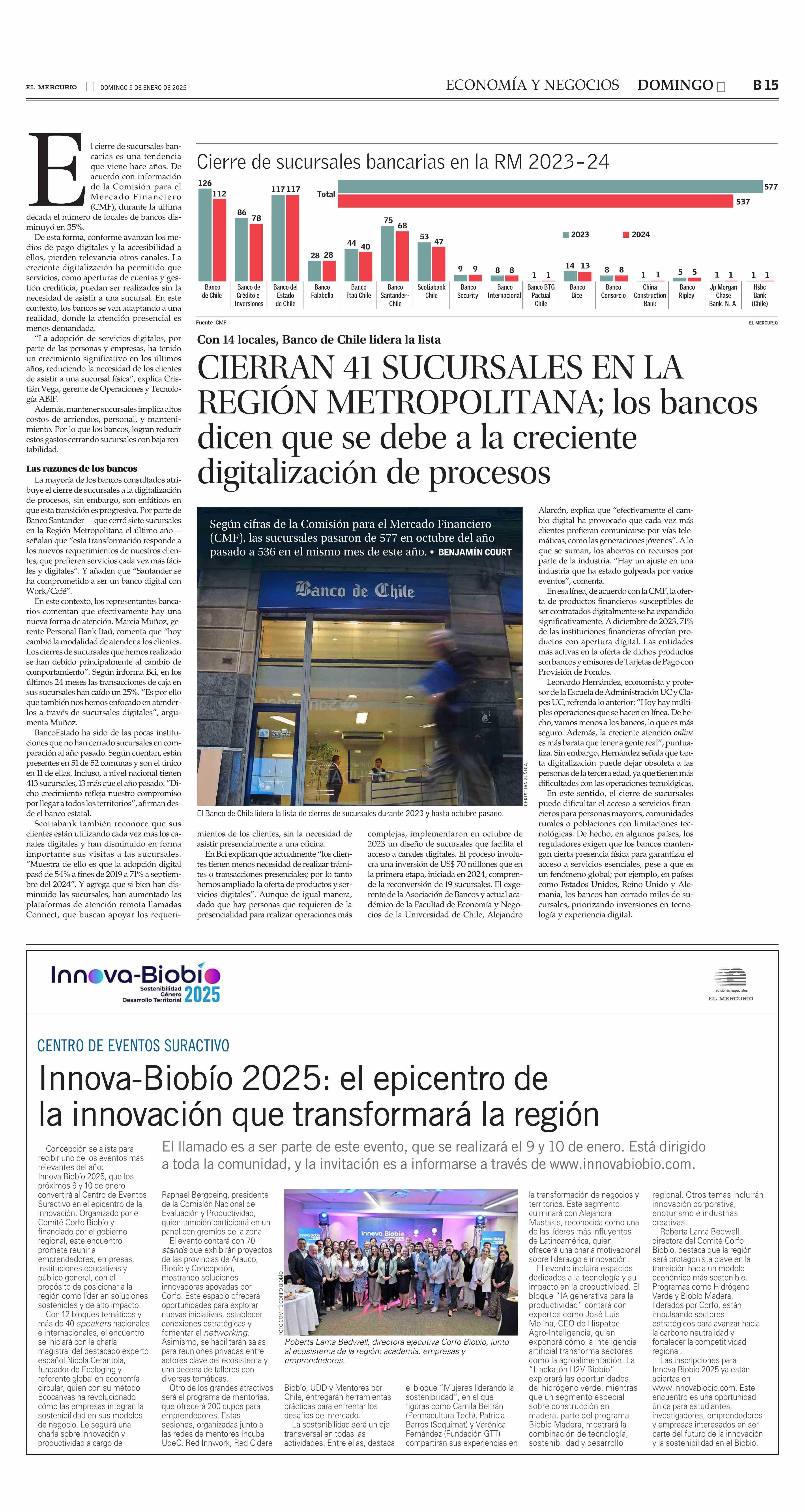 CIERRAN 41 SUCURSALES EN LA REGIÓN METROPOLITANA; los bancos dicen que se debe a la creciente digitalización de procesos 05-01-2025 El Mercurio |