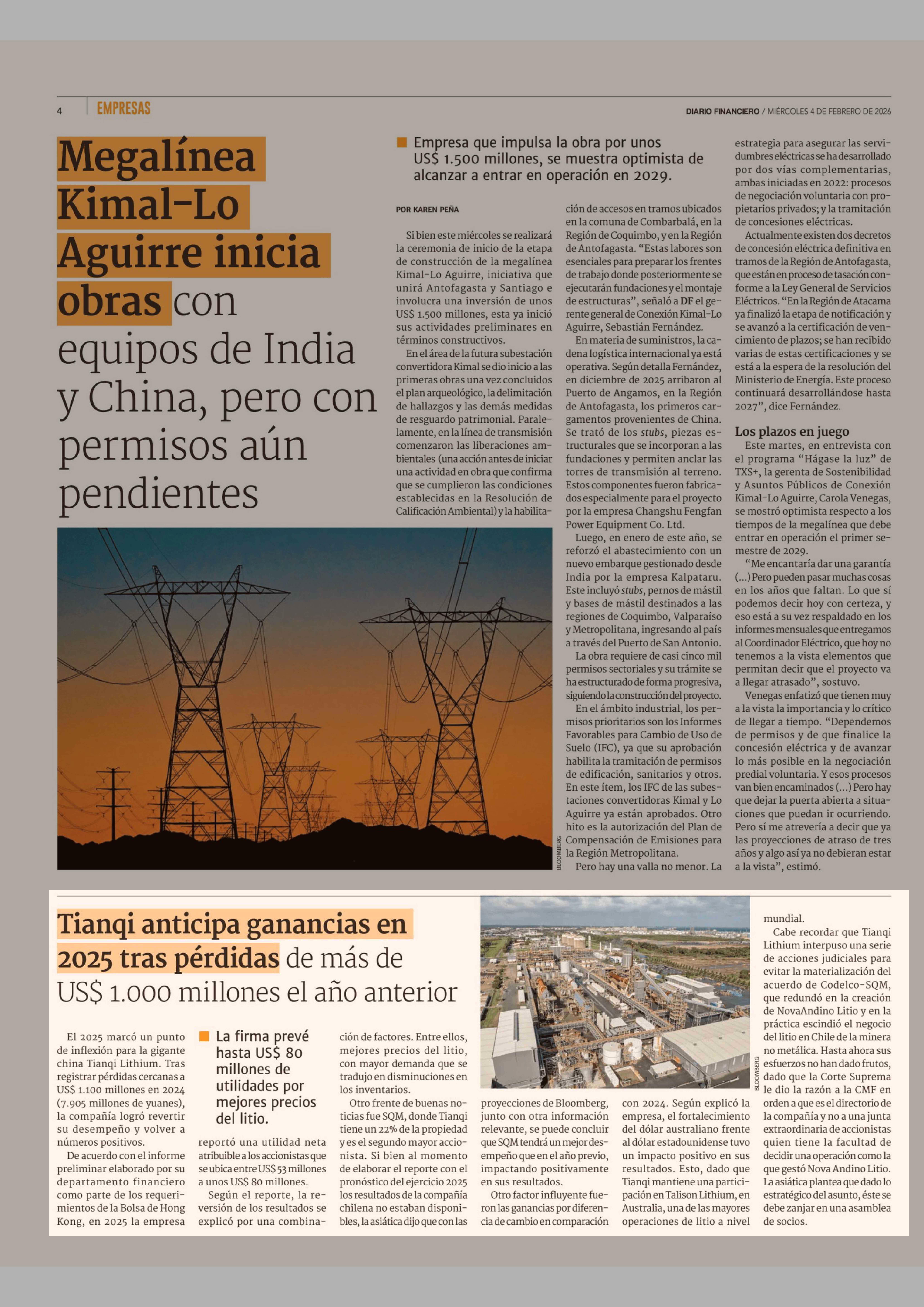 Tianqi anticipa ganancias en 2025 tras pérdidas de más de US$ 1.000 millones el año anterior 04-02-2026 Diario Financiero |