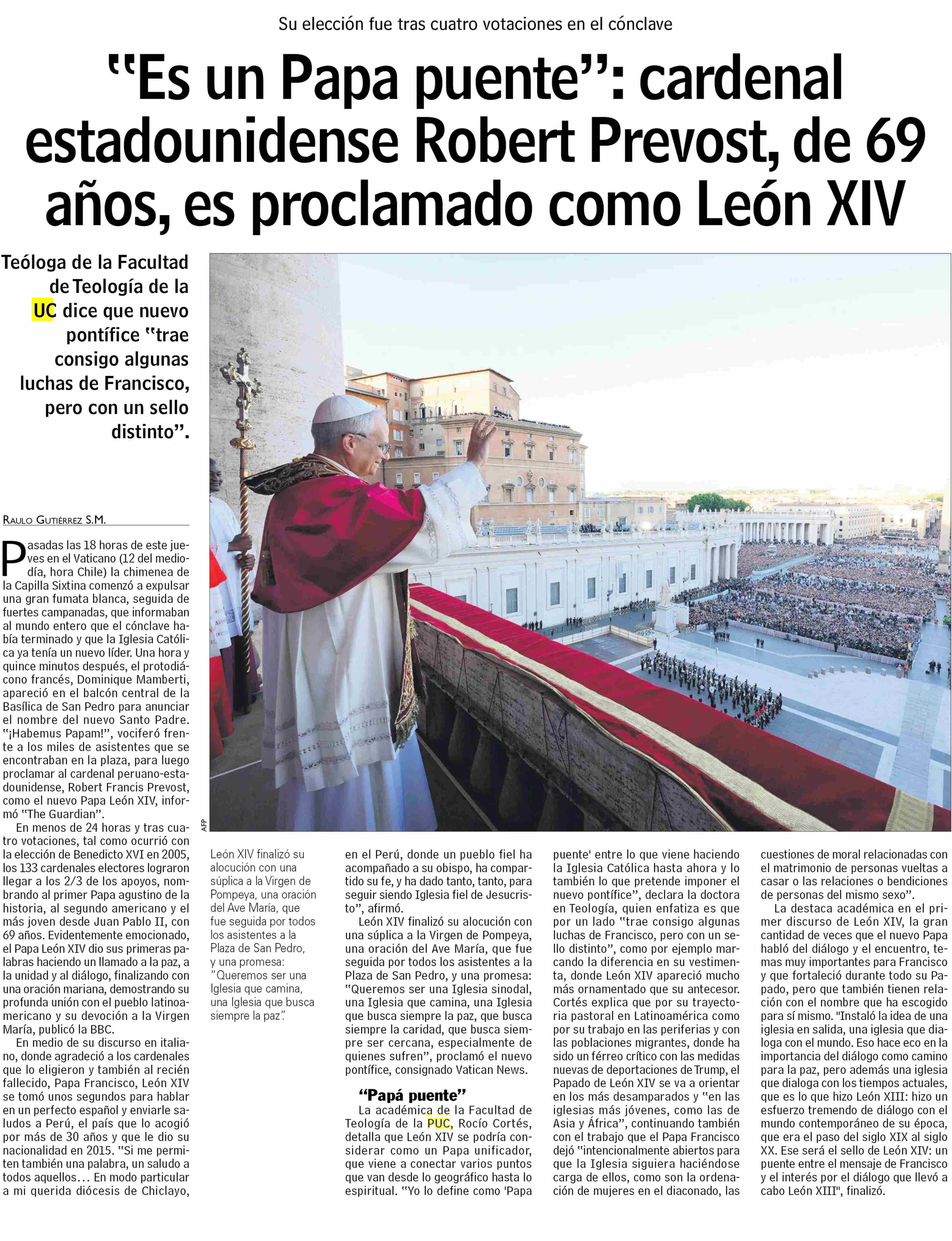 | Título: | “Es un Papa puente”: cardenal estadounidense Robert Prevost, de 69 años, es proclamado como León XIV |