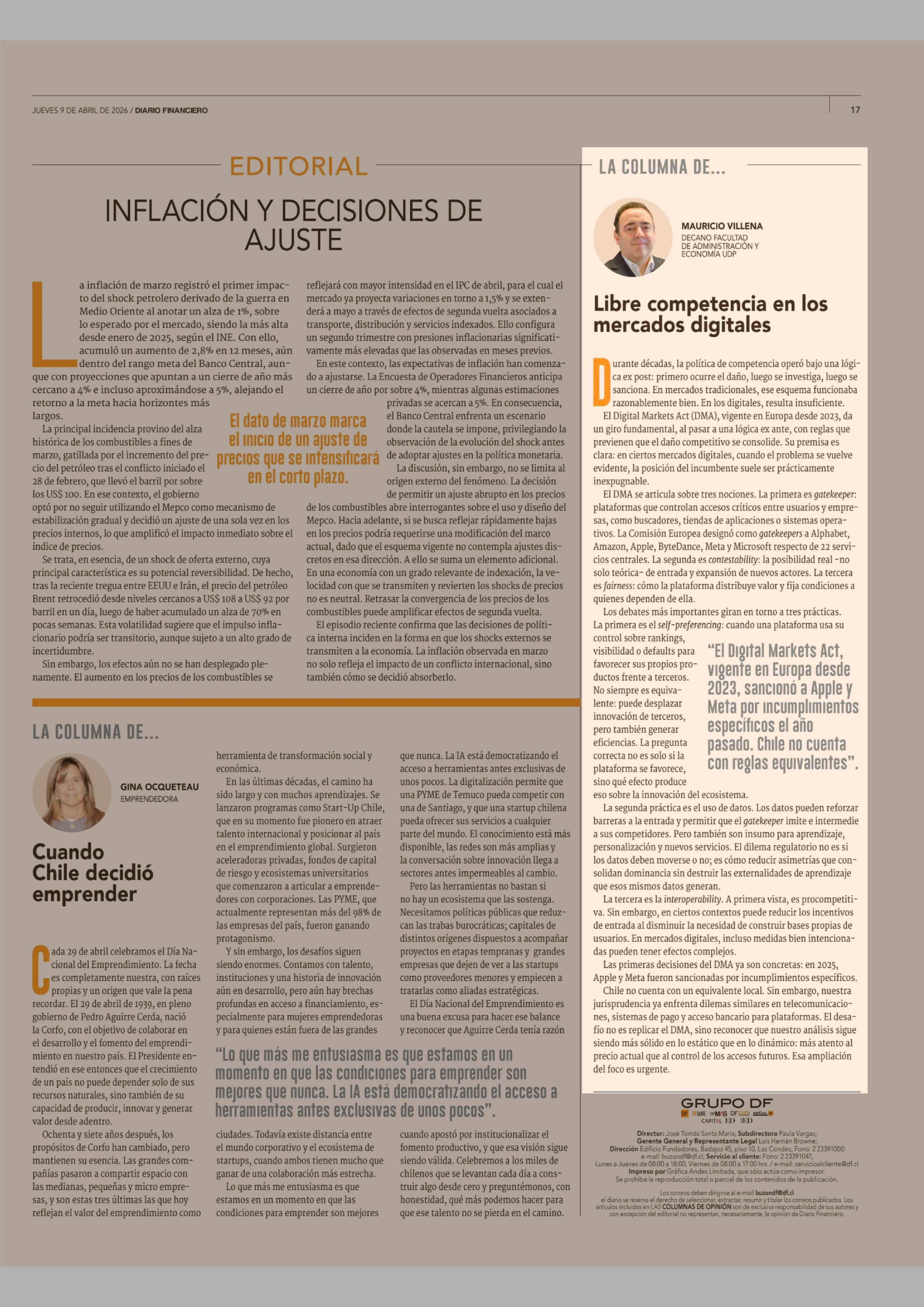 Columnas de Opinión: Libre competencia en los mercados digitales 09-04-2026 Diario Financiero |