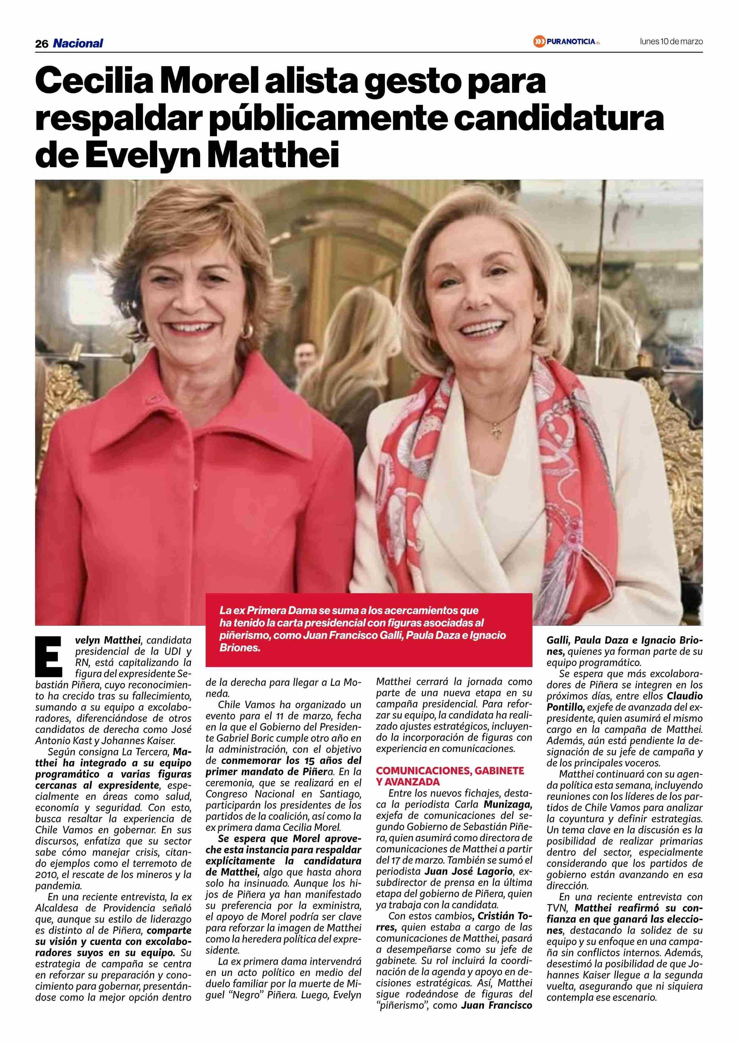 Cecilia Morel alista gesto para respaldar públicamente candidatura de Evelyn Matthei 10-03-2025 Puranoticia.cl |