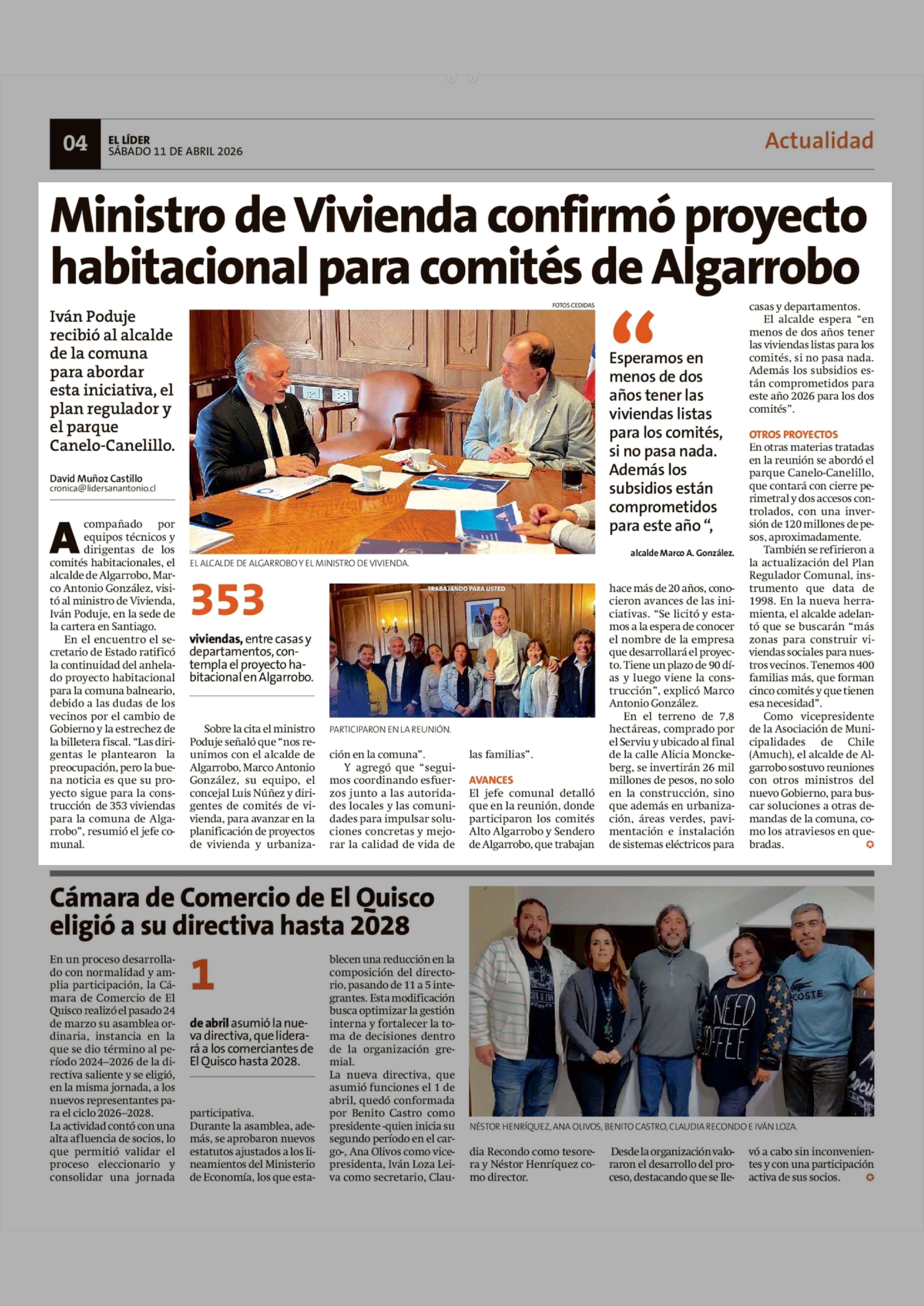 Ministro de Vivienda confirmó proyecto habitacional para comités de Algarrobo 11-04-2026 El Líder |