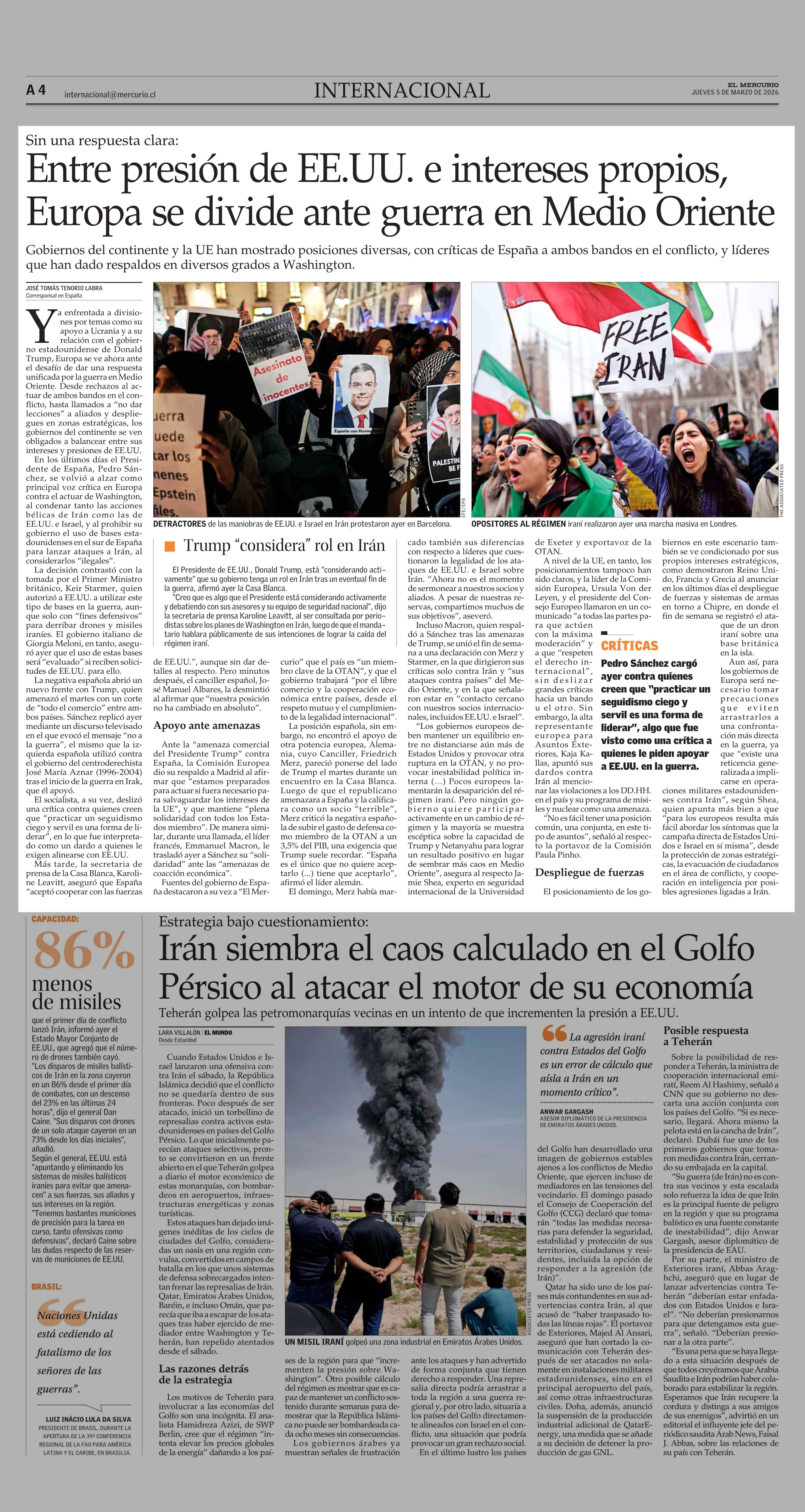 Entre presión de EE.UU. e intereses propios, Europa se divide ante guerra en Medio Oriente 05-03-2026 El Mercurio |