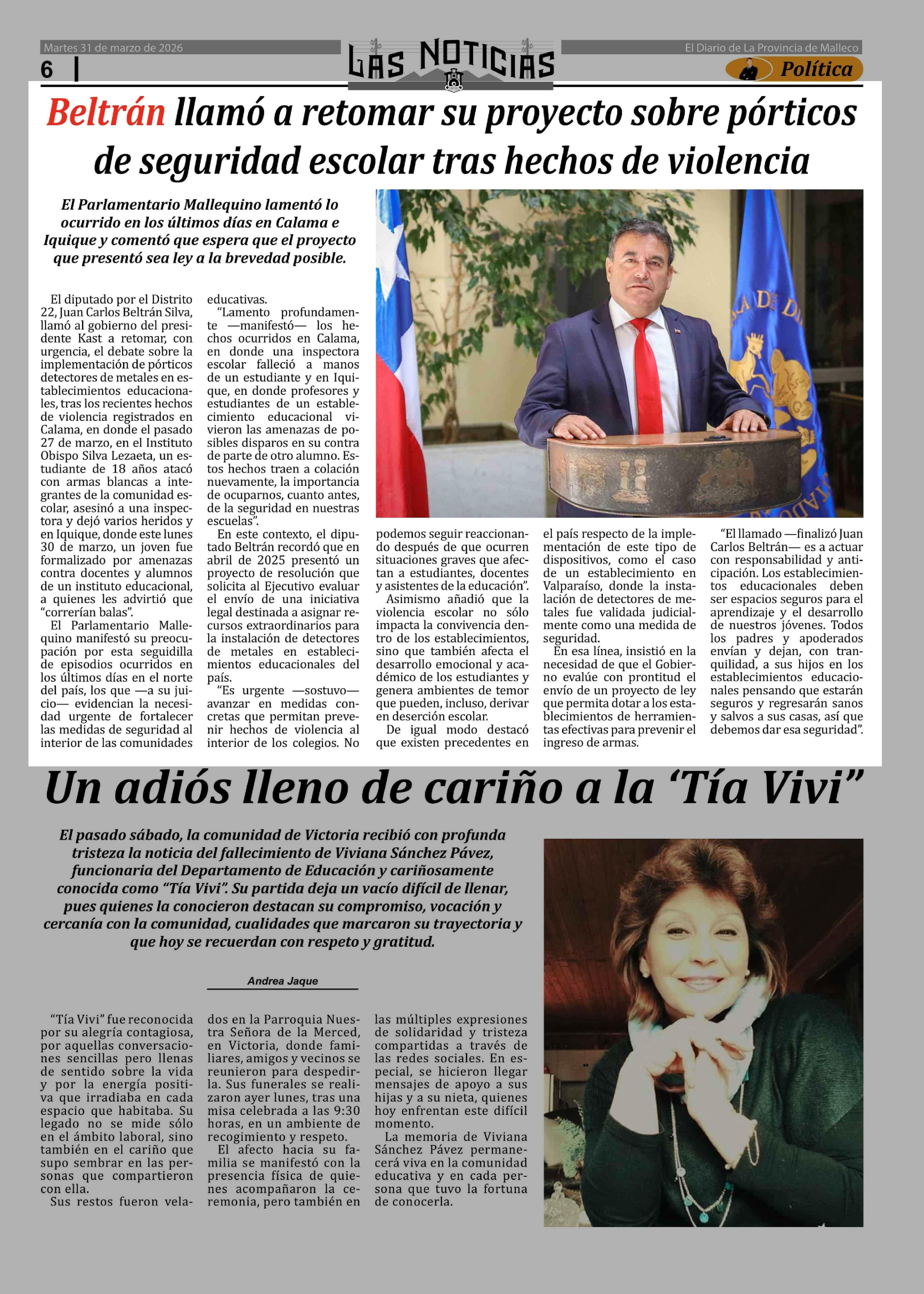 Beltrán llamó a retomar su proyecto sobre pórticos de seguridad escolar tras hechos de violencia 31-03-2026 Las Noticias |