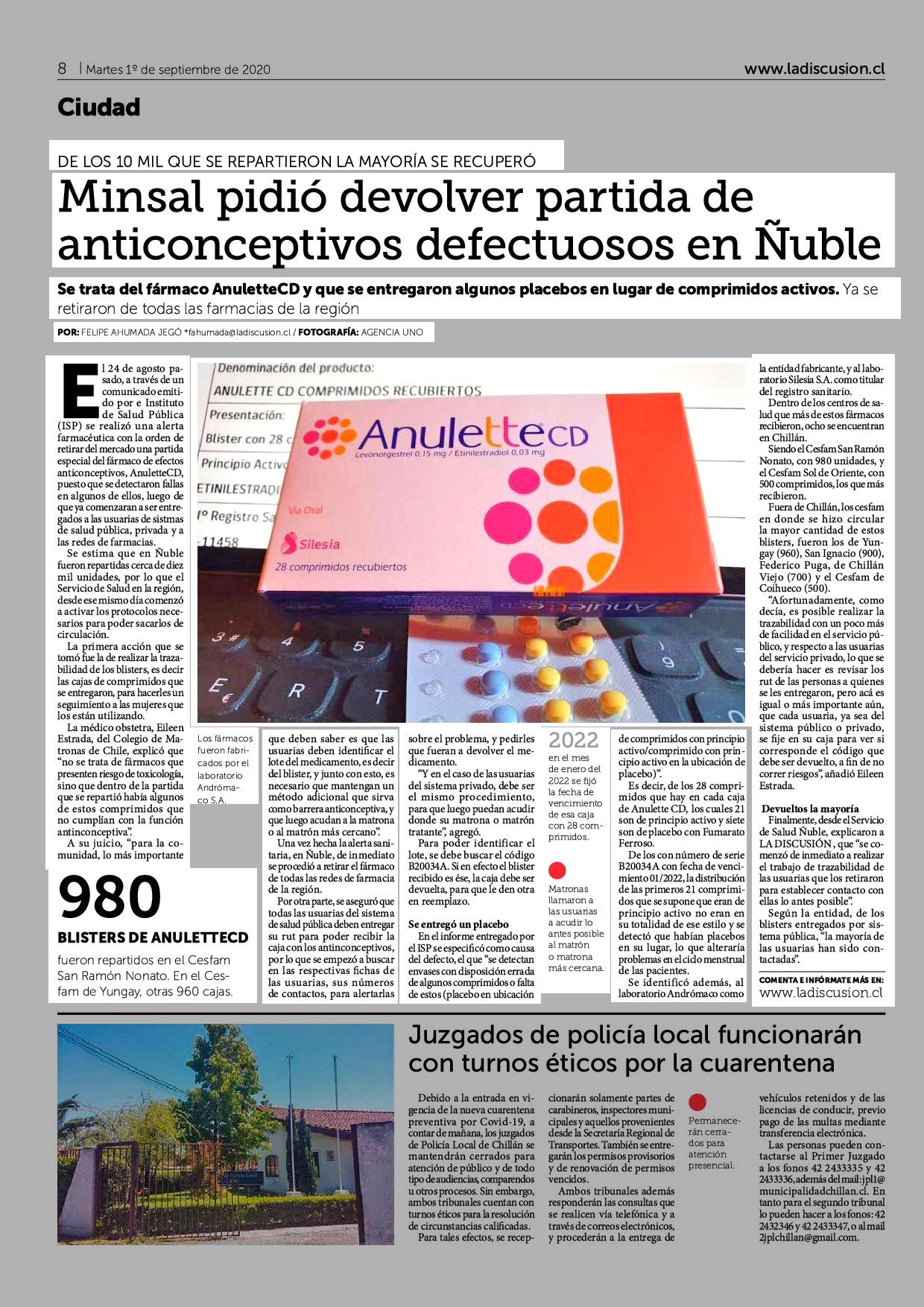 Título: Minsal pidió devolver partida de anticonceptivos defectuosos en Ñuble