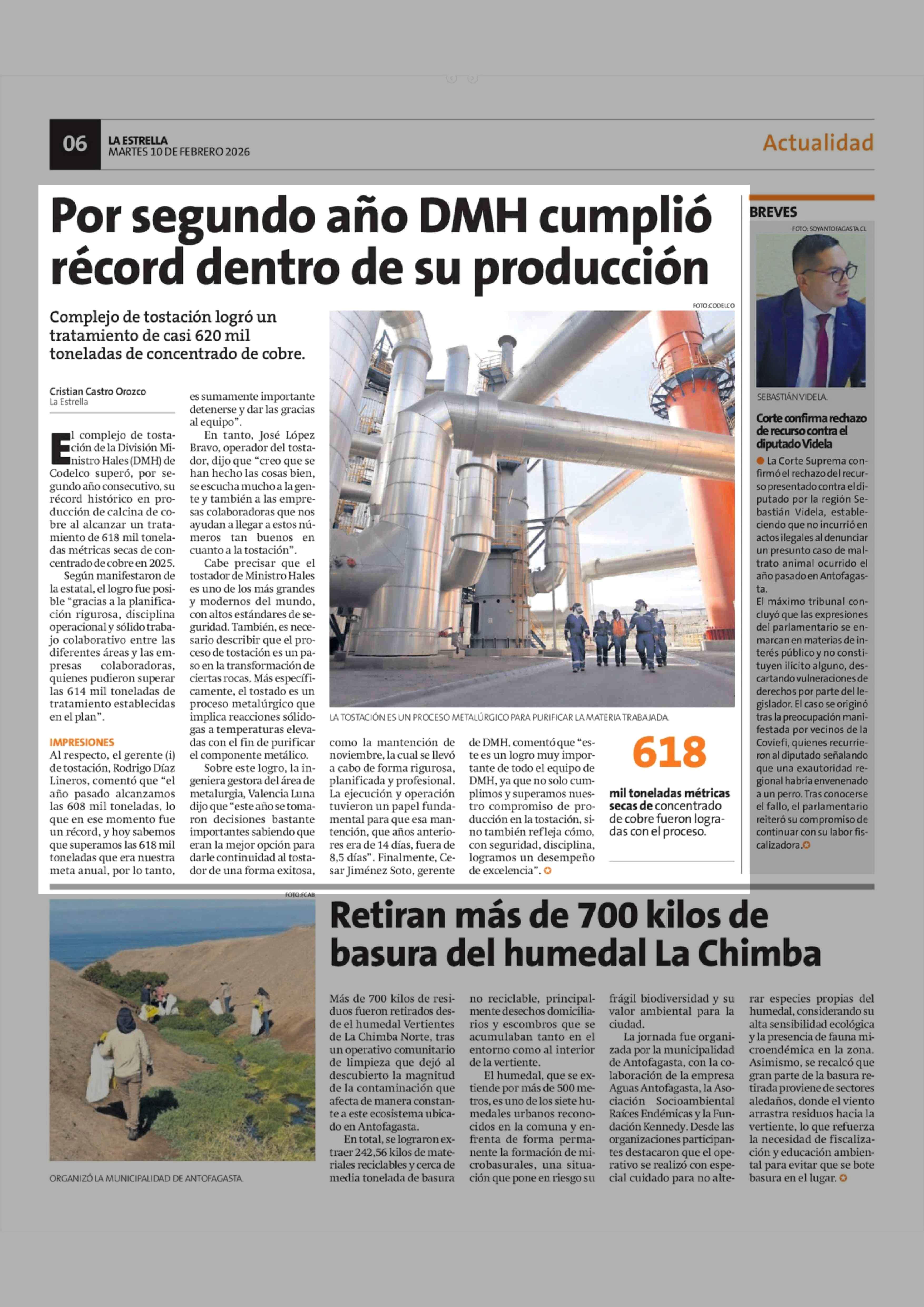 Por segundo año DMH cumplió récord dentro de su producción 10-02-2026 La Estrella de Antofagasta |