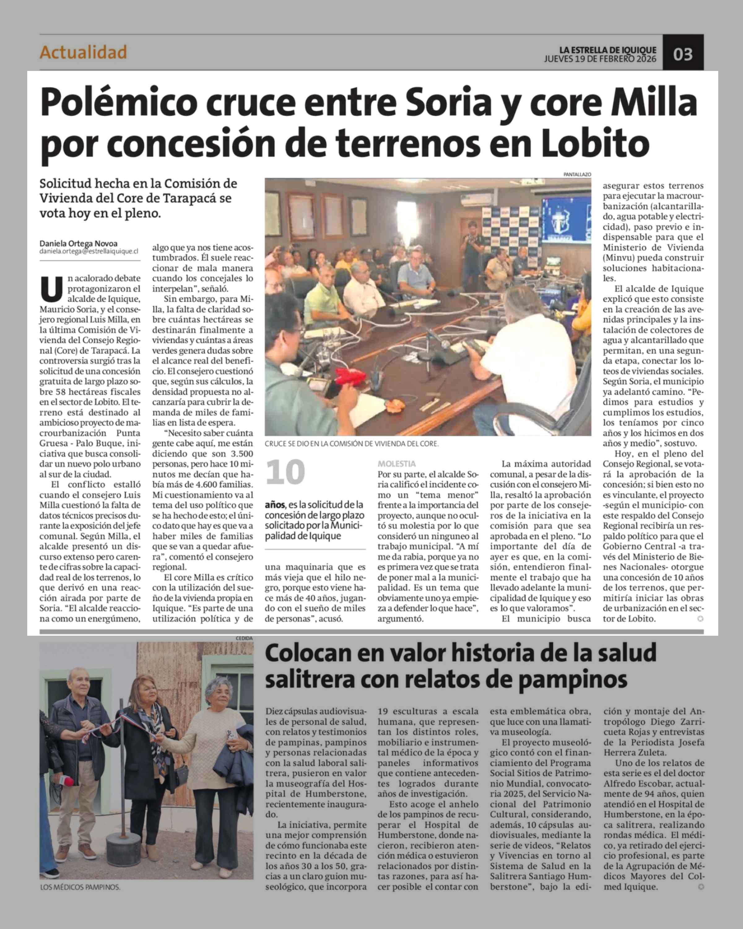 Polémico cruce entre Soria y core Milla por concesión de terrenos en Lobito 19-02-2026 La Estrella de Iquique |