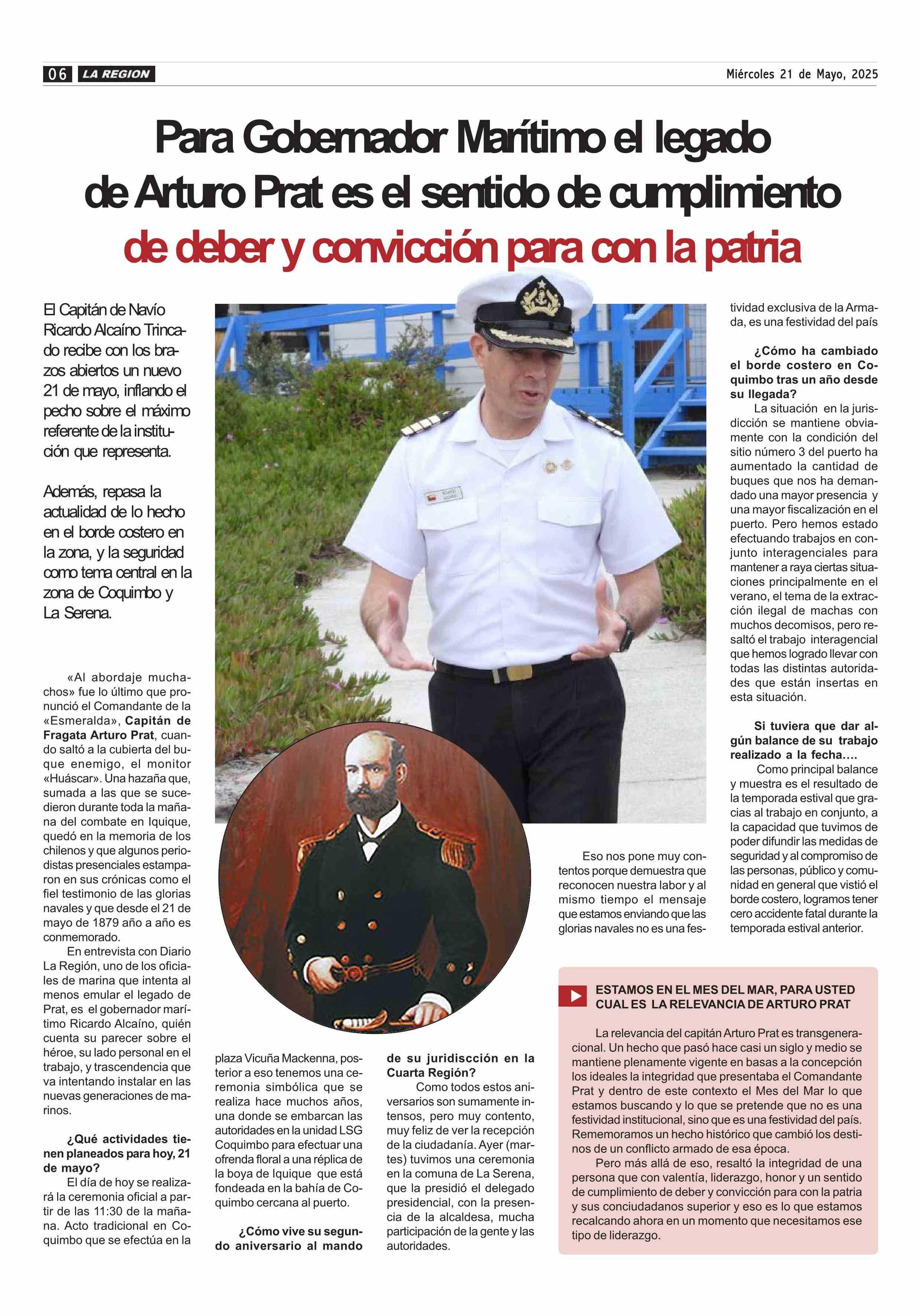 Para Gobernador Marítimo el legado de Arturo Prat es el sentido de cumplimiento de de 21-05-2025 Diario la Región |
