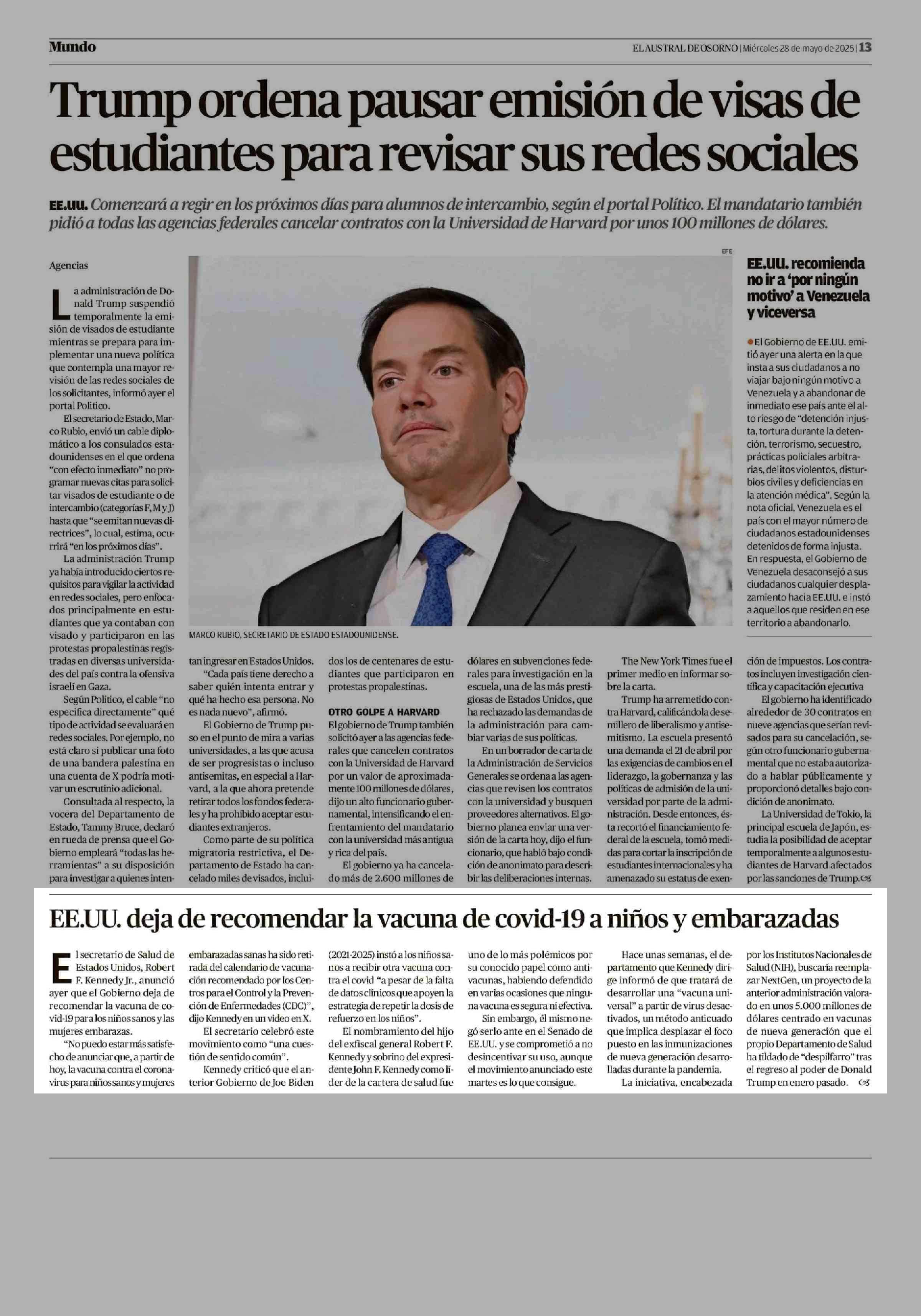 EE.UU. deja de recomendar la vacuna de covid-19 a niños y embarazadas 28-05-2025 El Austral de Osorno |