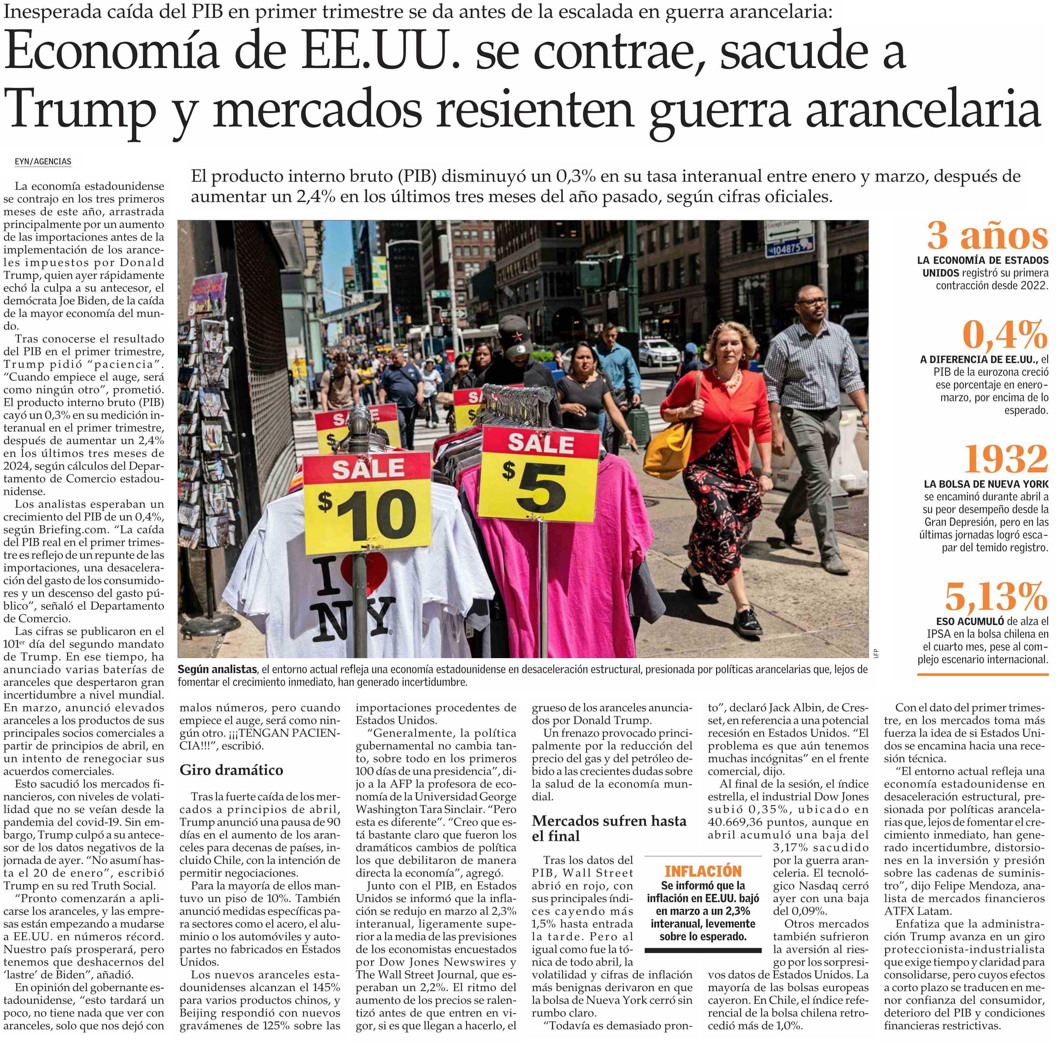 Economía de EE.UU. Se contrae, sacude a Trump y mercados resienten guerra arancelaria 01-05-2025 El Mercurio |