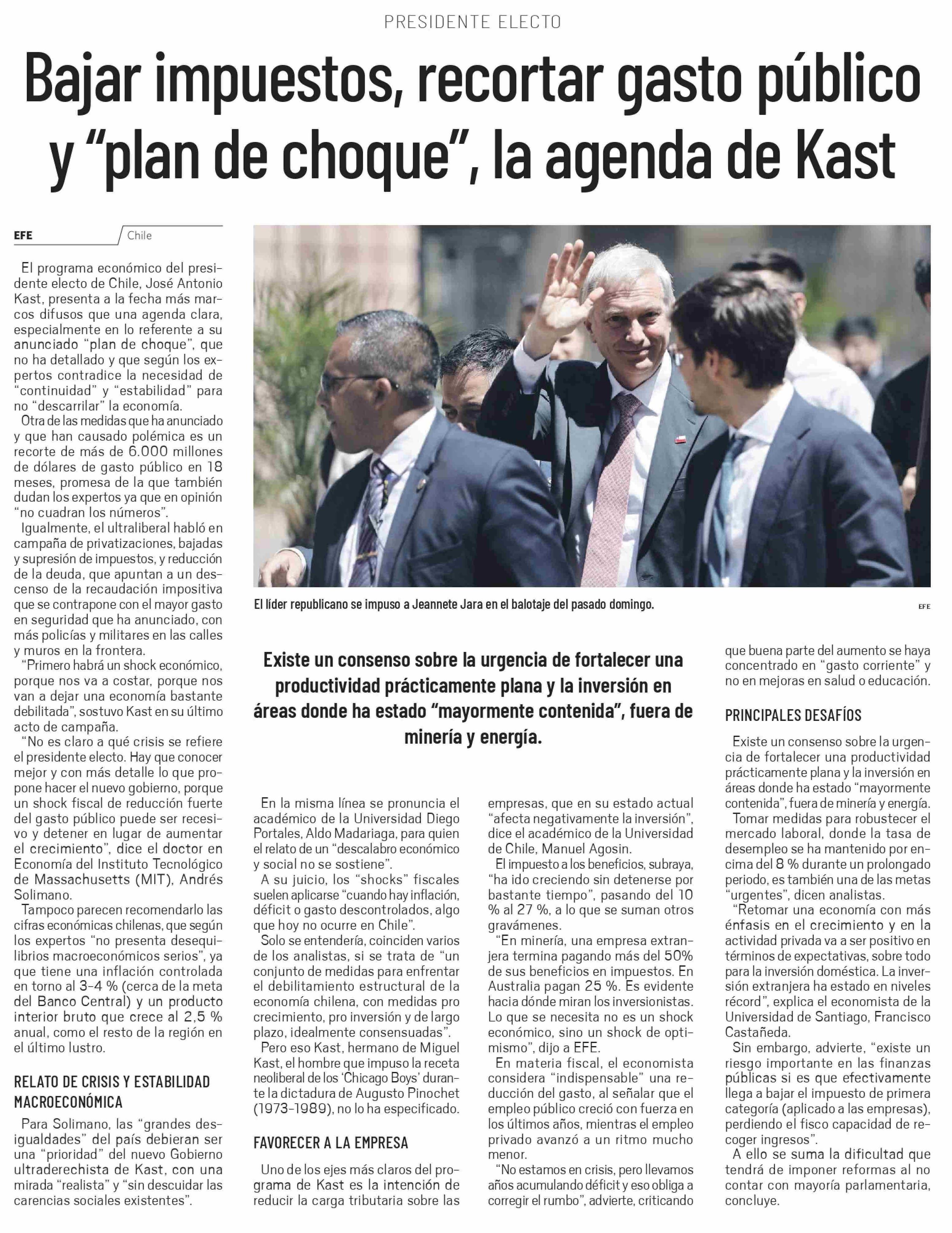 | Título: | Bajar impuestos, recortar gasto público y "plan de choque", la agenda de Kast |