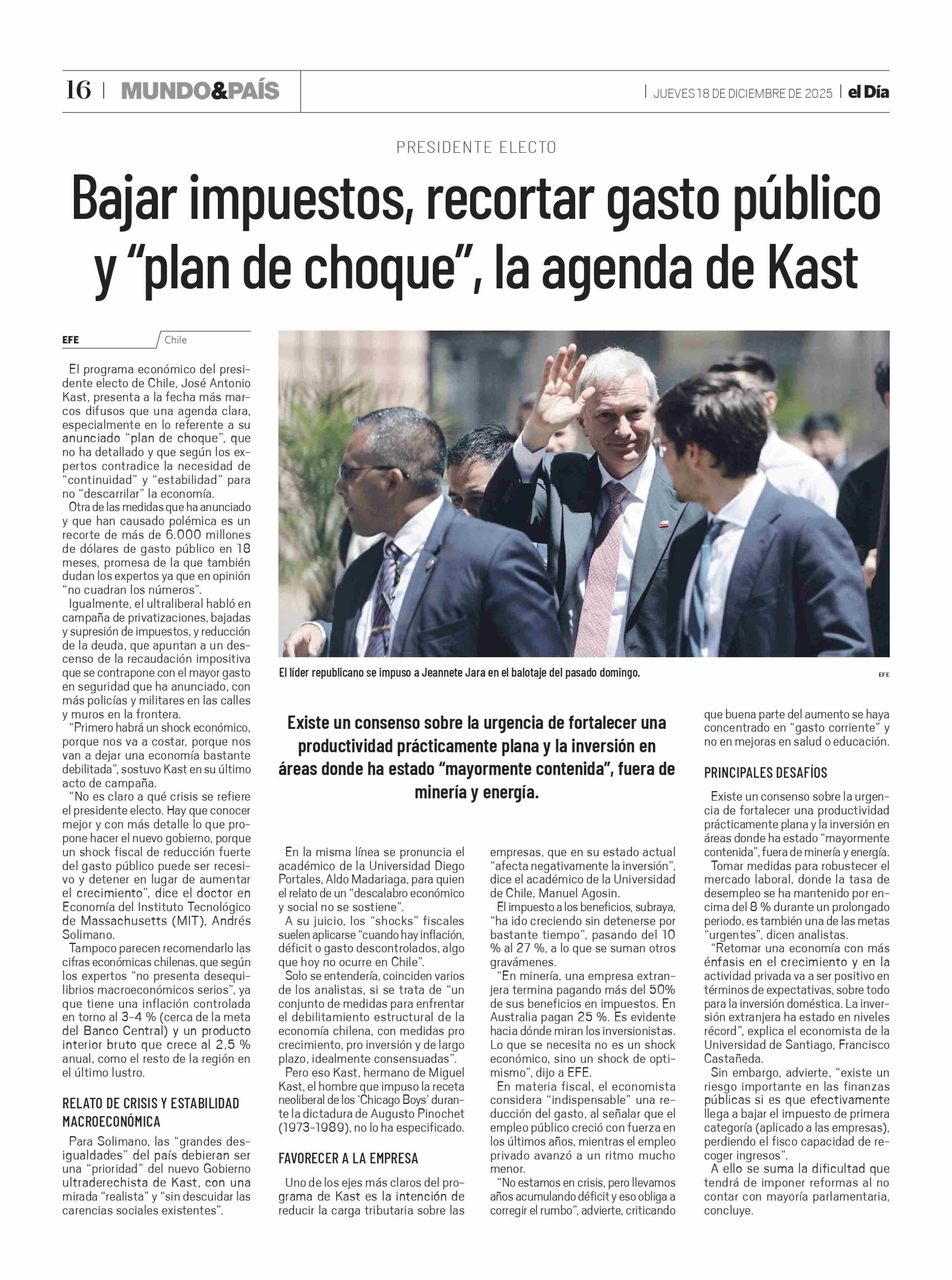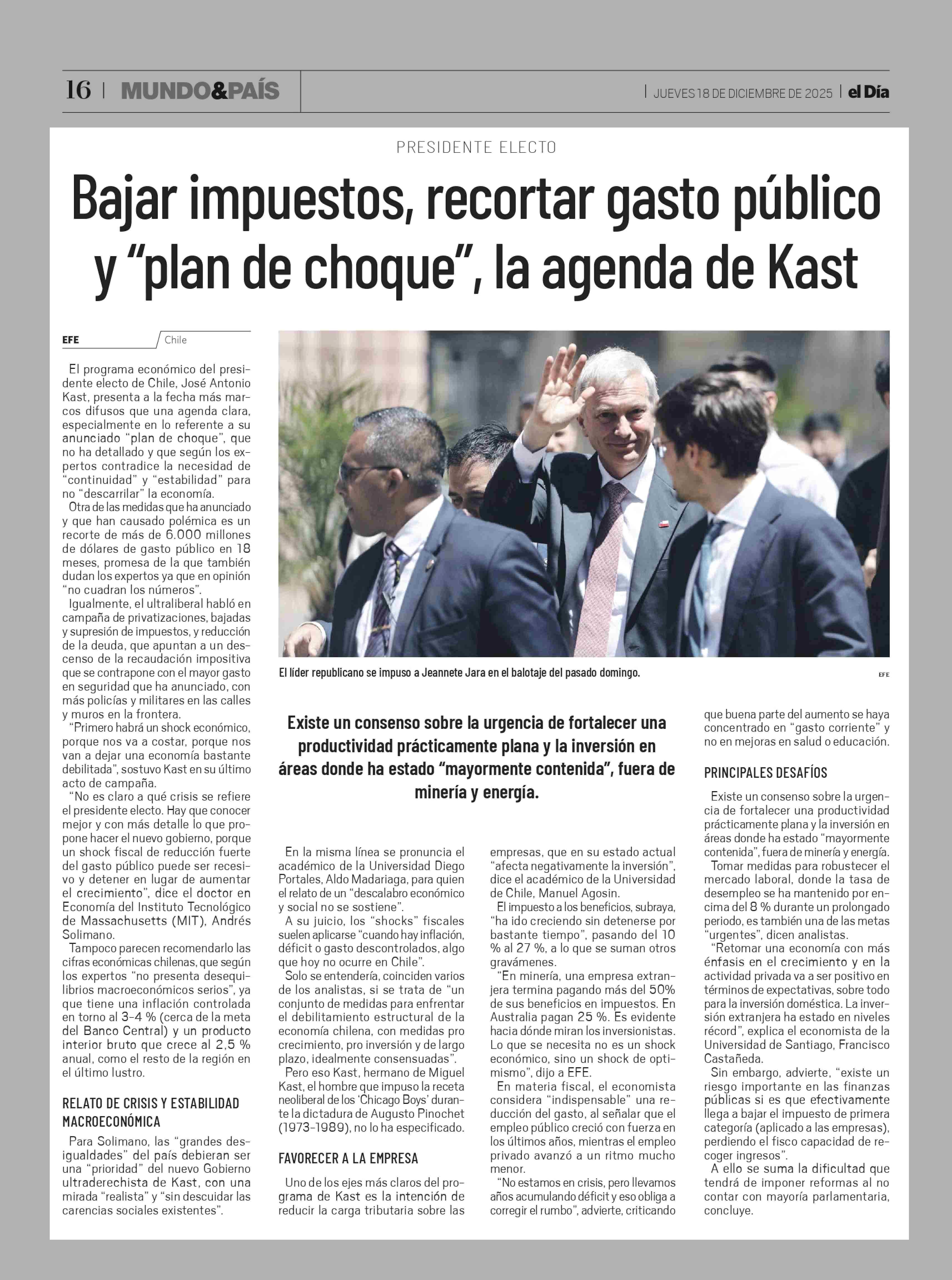 Bajar impuestos, recortar gasto público y "plan de choque", la agenda de Kast 18-12-2025 El Día |