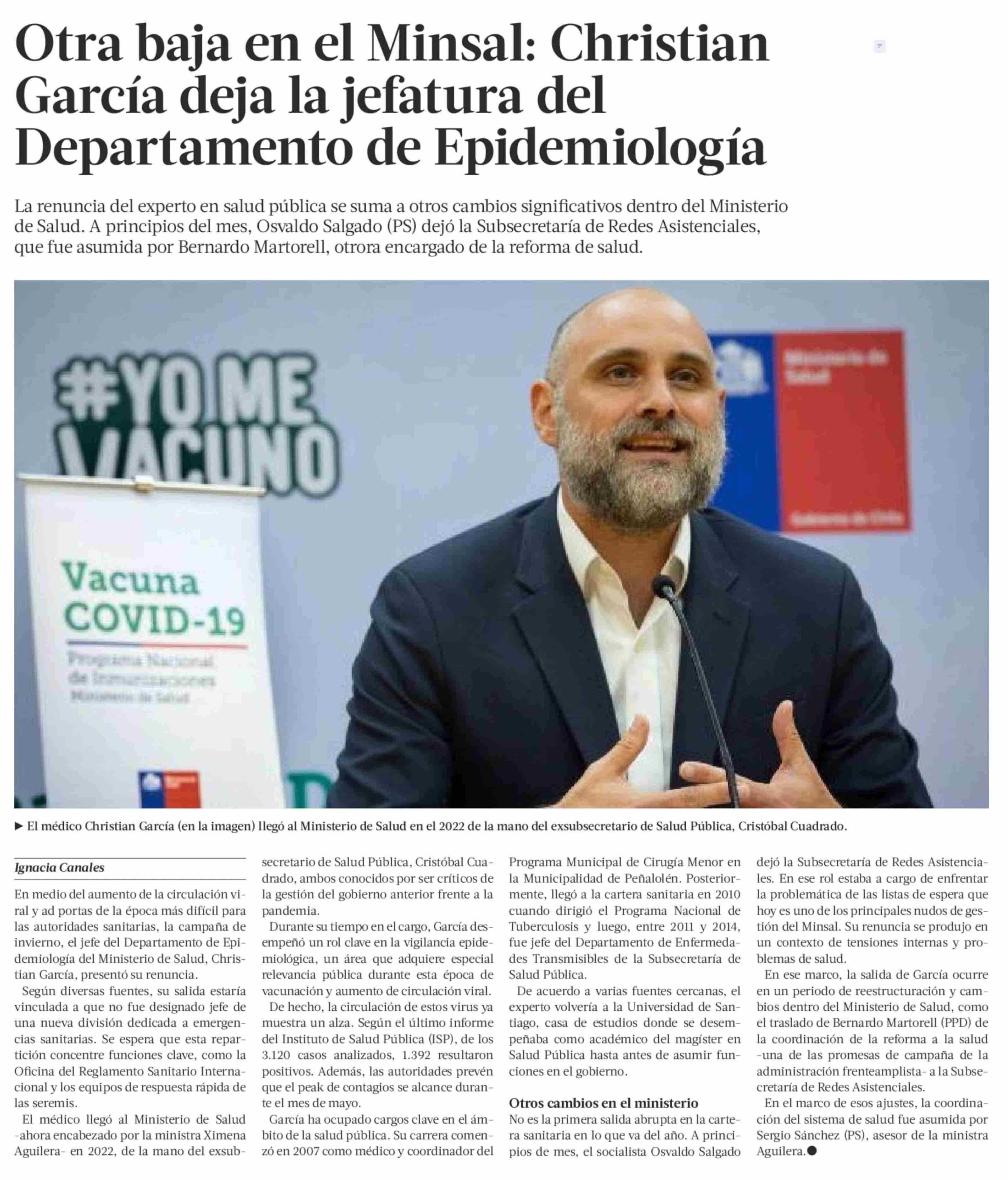 Otra baja en el Minsal: Christian García deja la jefatura del Departamento de Epidemiología 30-04-2025 La Tercera |