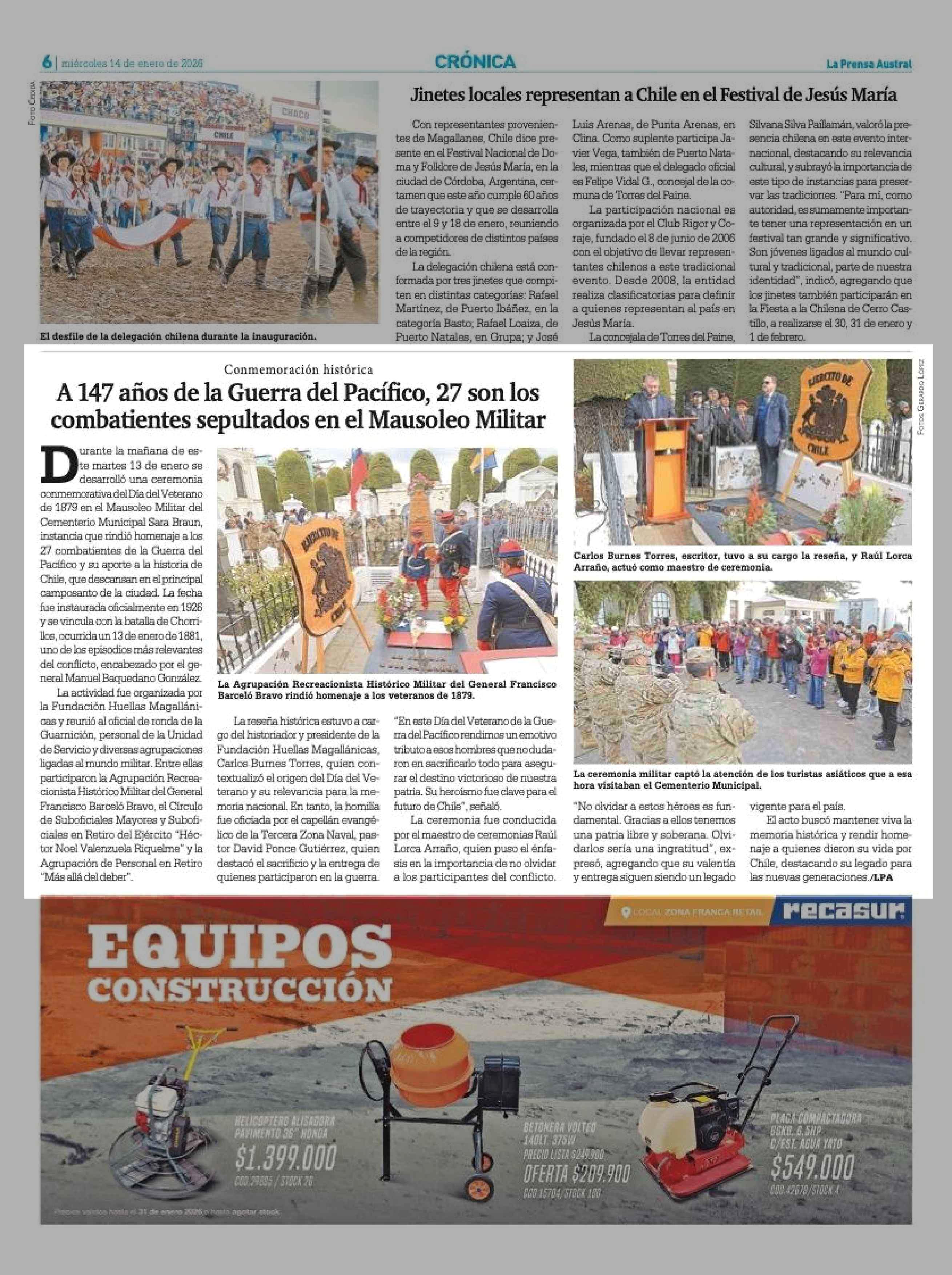 A 147 años de la Guerra del Pacífico, 27 son los combatientes sepultados en el Mausoleo Militar 14-01-2026 La Prensa Austral |