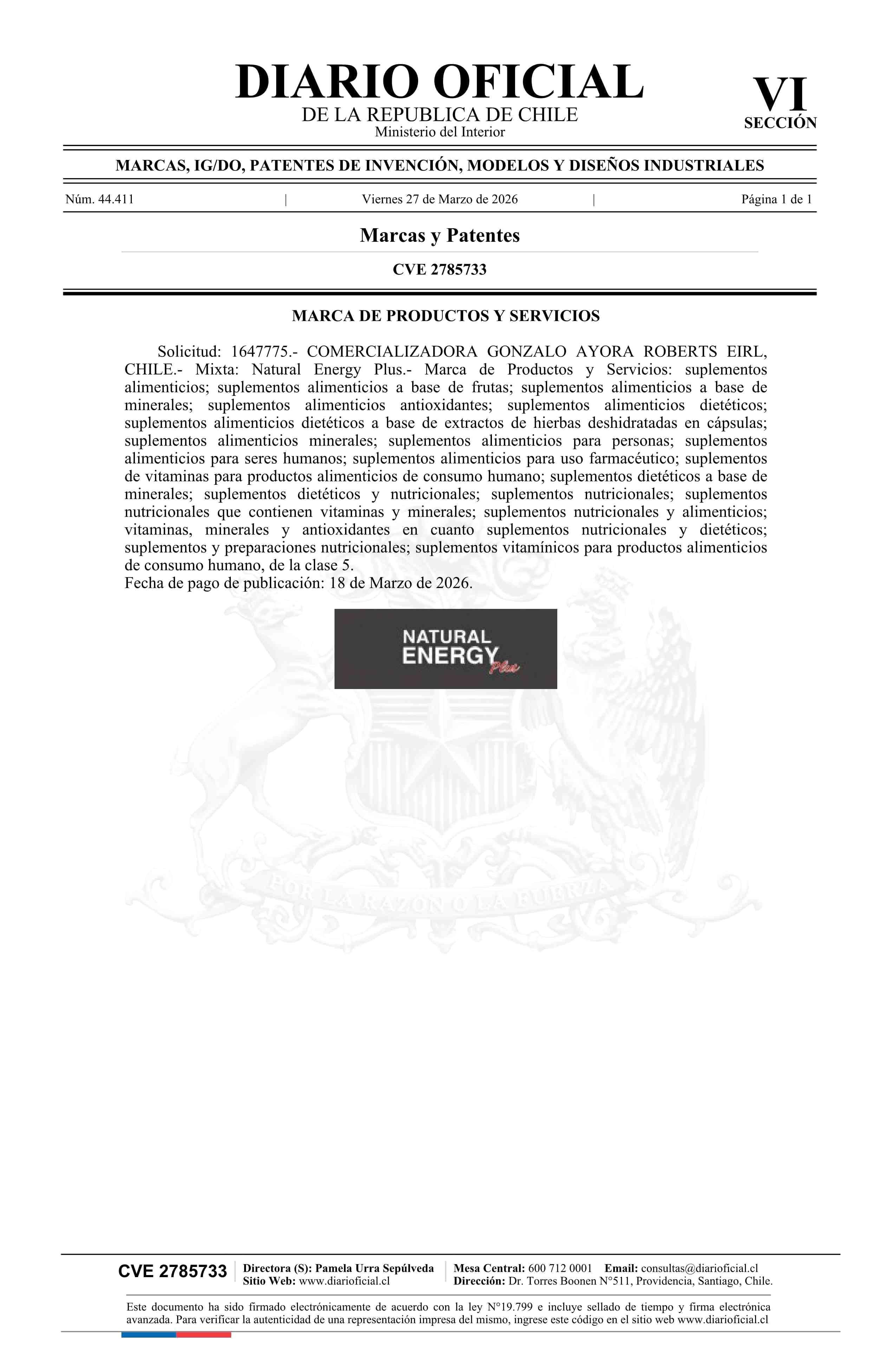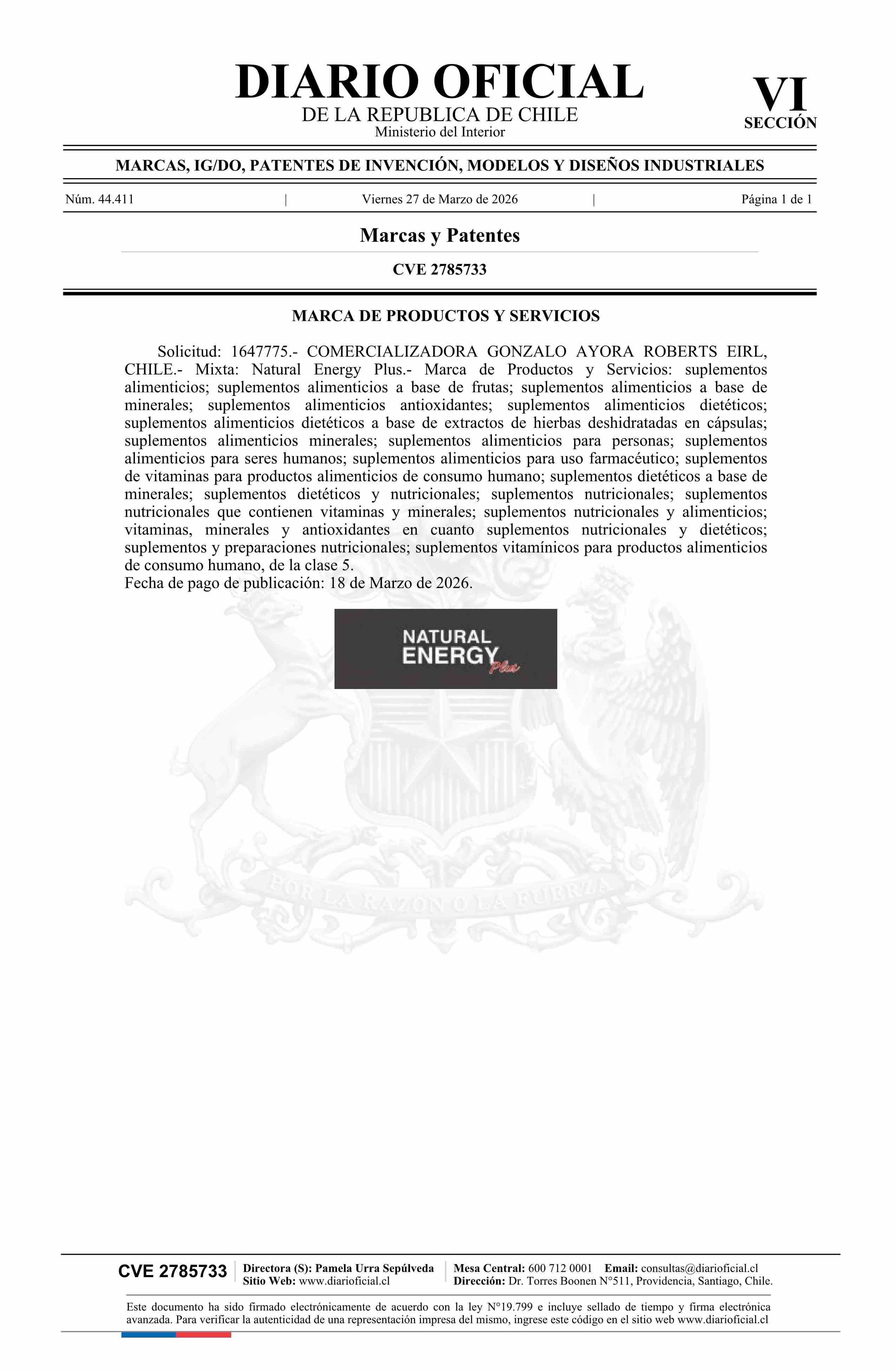 Fuente: Diario Oficial Edición Electrónica (Diario Oficial de Chile - 6 Marcas Y Patentes) Página(s): 33