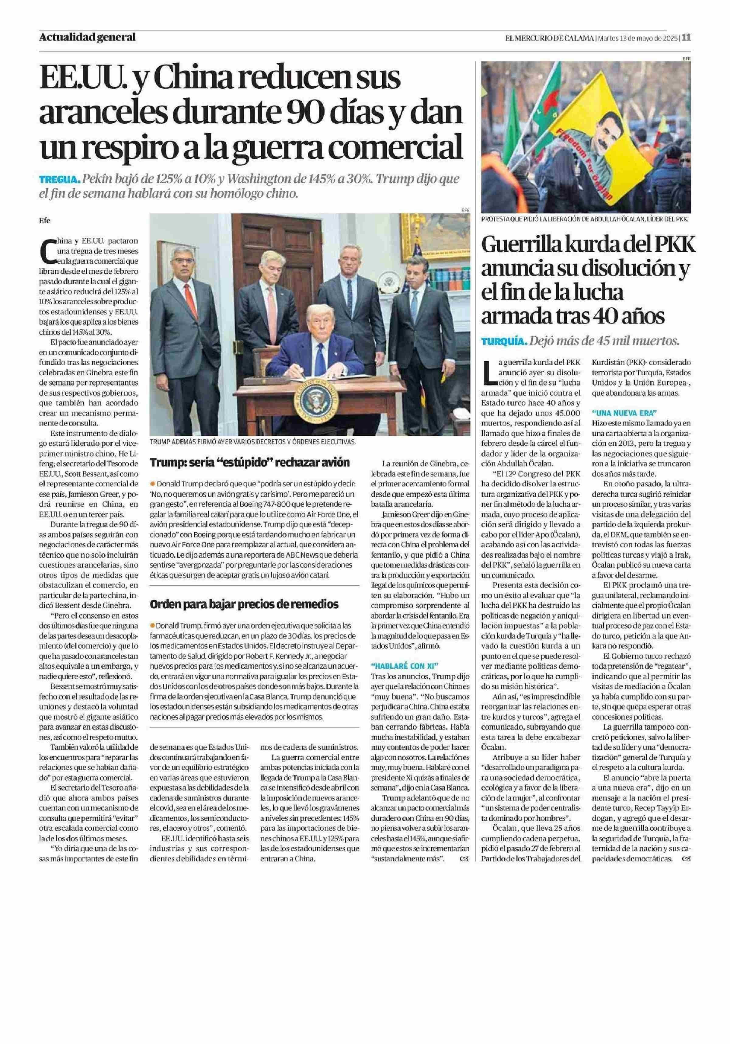 EEUU. y China reducen sus aranceles durante 90 días y dan un respiro a la guerra comercial 13-05-2025 El Mercurio de Calama |