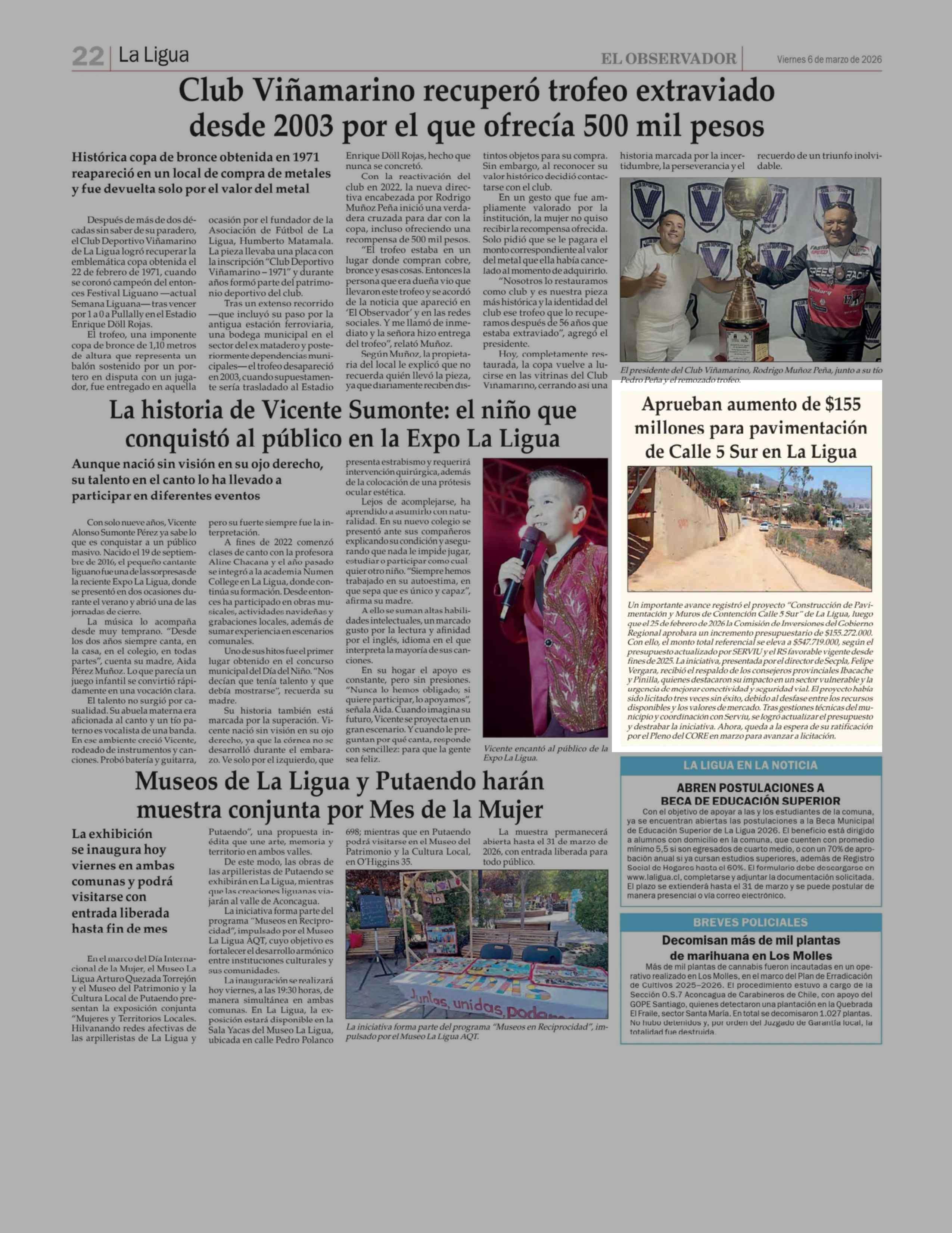 Aprueban aumento de $155 millones para pavimentación de Calle 5 Sur en La Ligua 06-03-2026 El Observador |