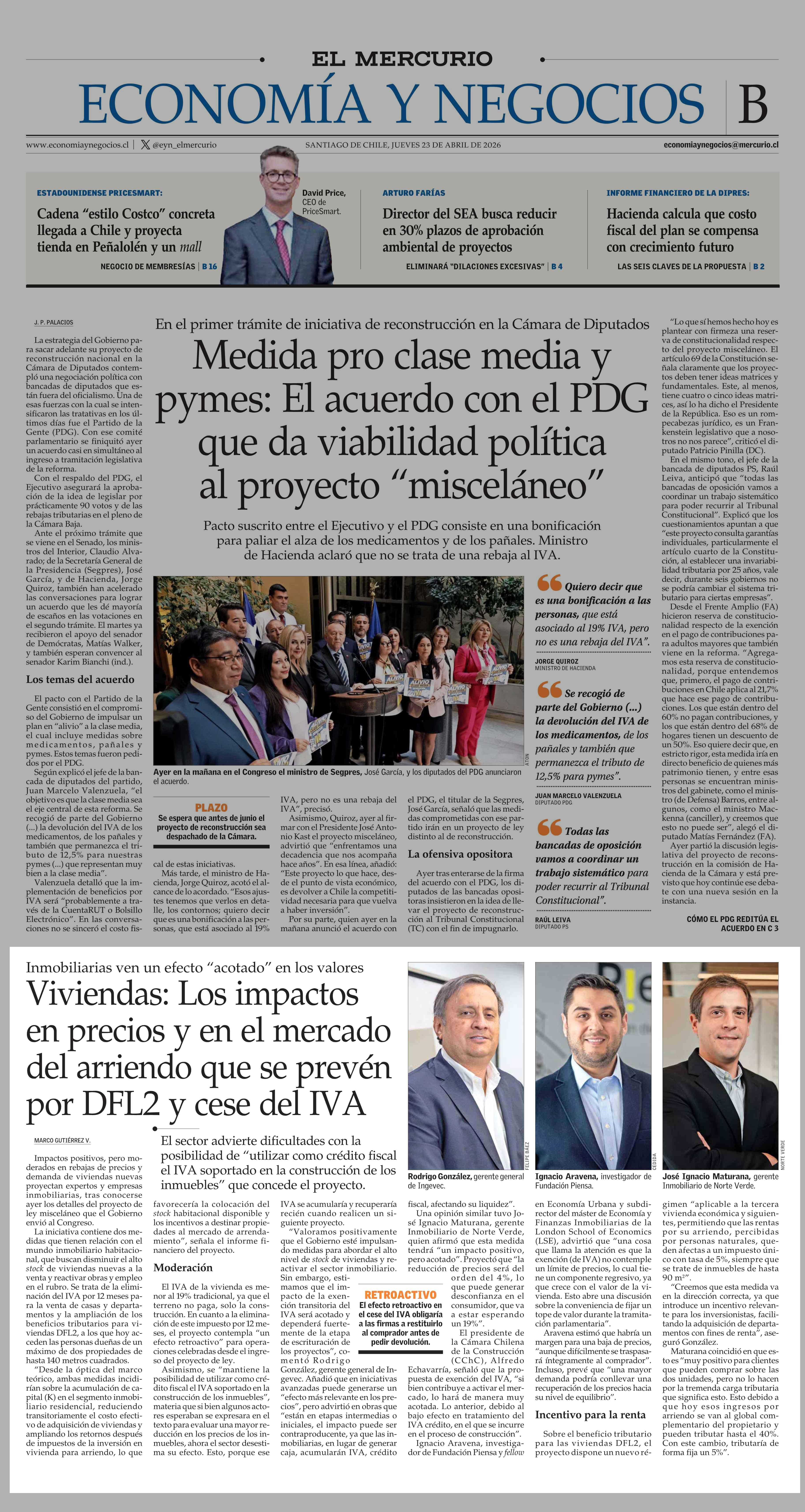 Viviendas: Los impactos en precios y en el mercado del arriendo que se prevén por DFL2 y cese del IVA 23-04-2026 El Mercurio |