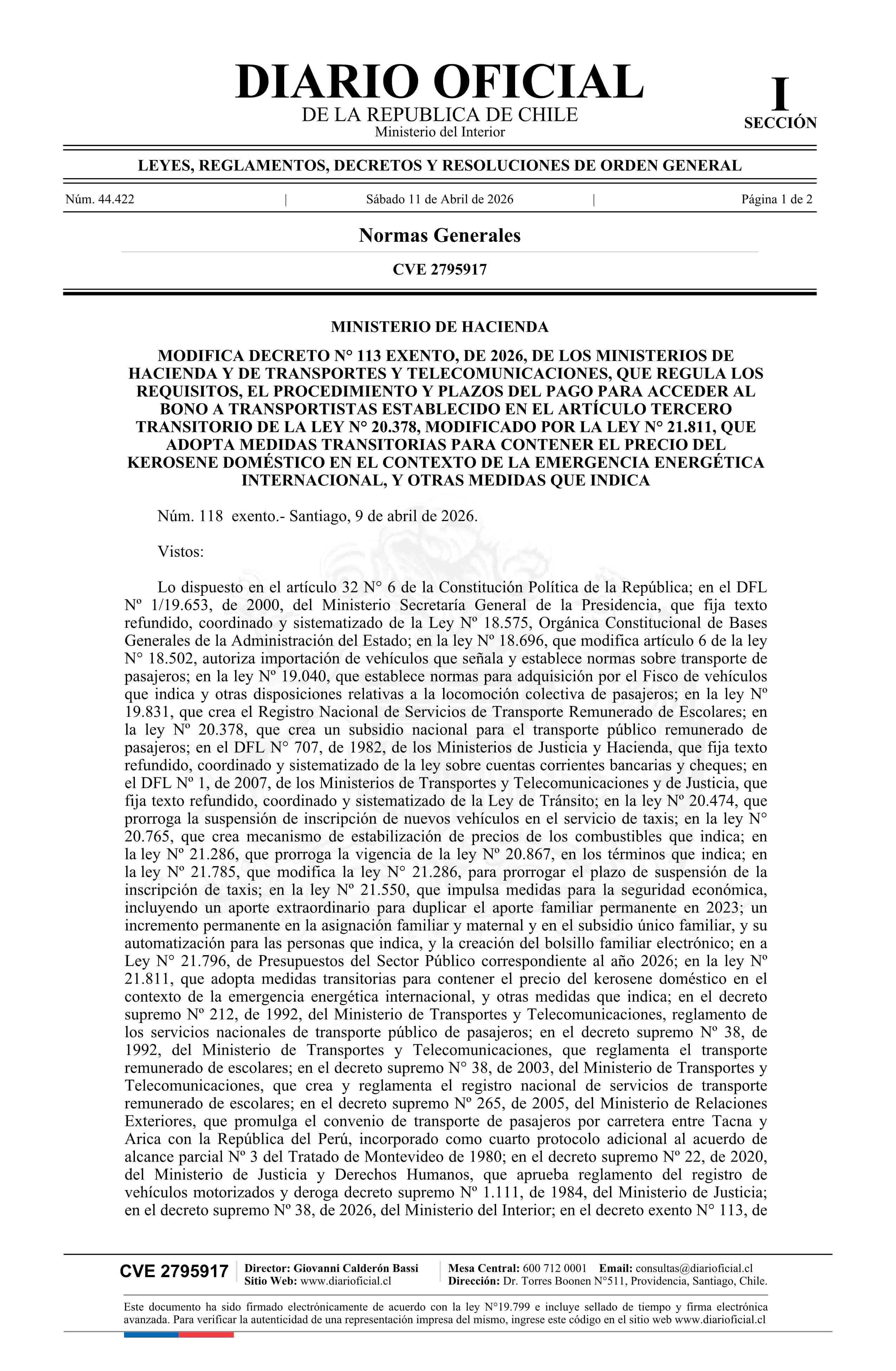 | Título: | Decreto exento número 118, de 2026.- Modifica decreto N° 113 exento, de 2026, de los Ministerios de Hacienda y de Transportes y Telecomunicaciones, que regula los requisitos, el procedimiento y plazos del pago para acceder al bono a transportistas establecido en el artículo tercero transitorio de la |