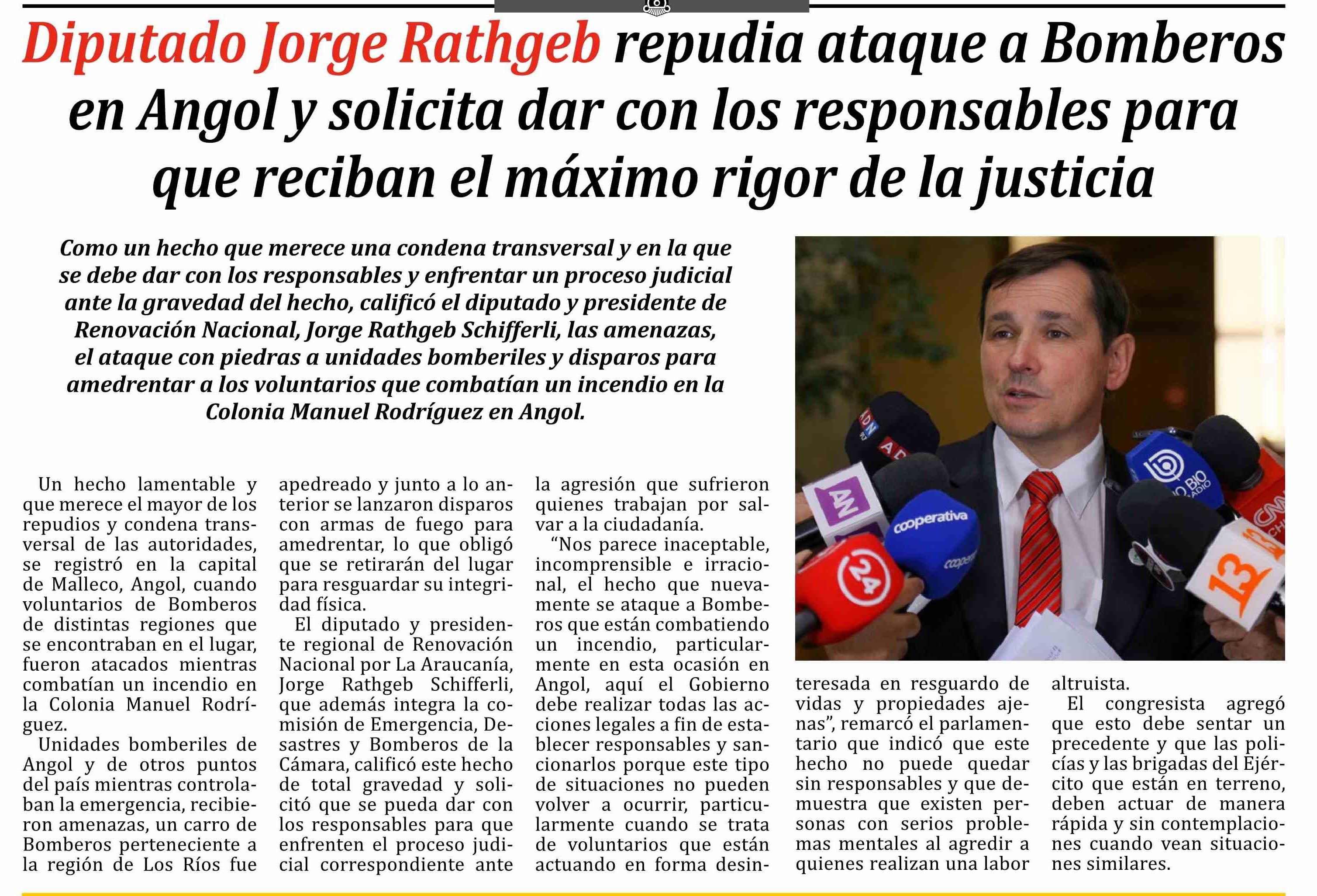 | Título: | Diputado Jorge Rathgeb repudia ataque a Bomberos en Angol y solicita dar con los responsables para que reciban el máximo rigor de la justicia |