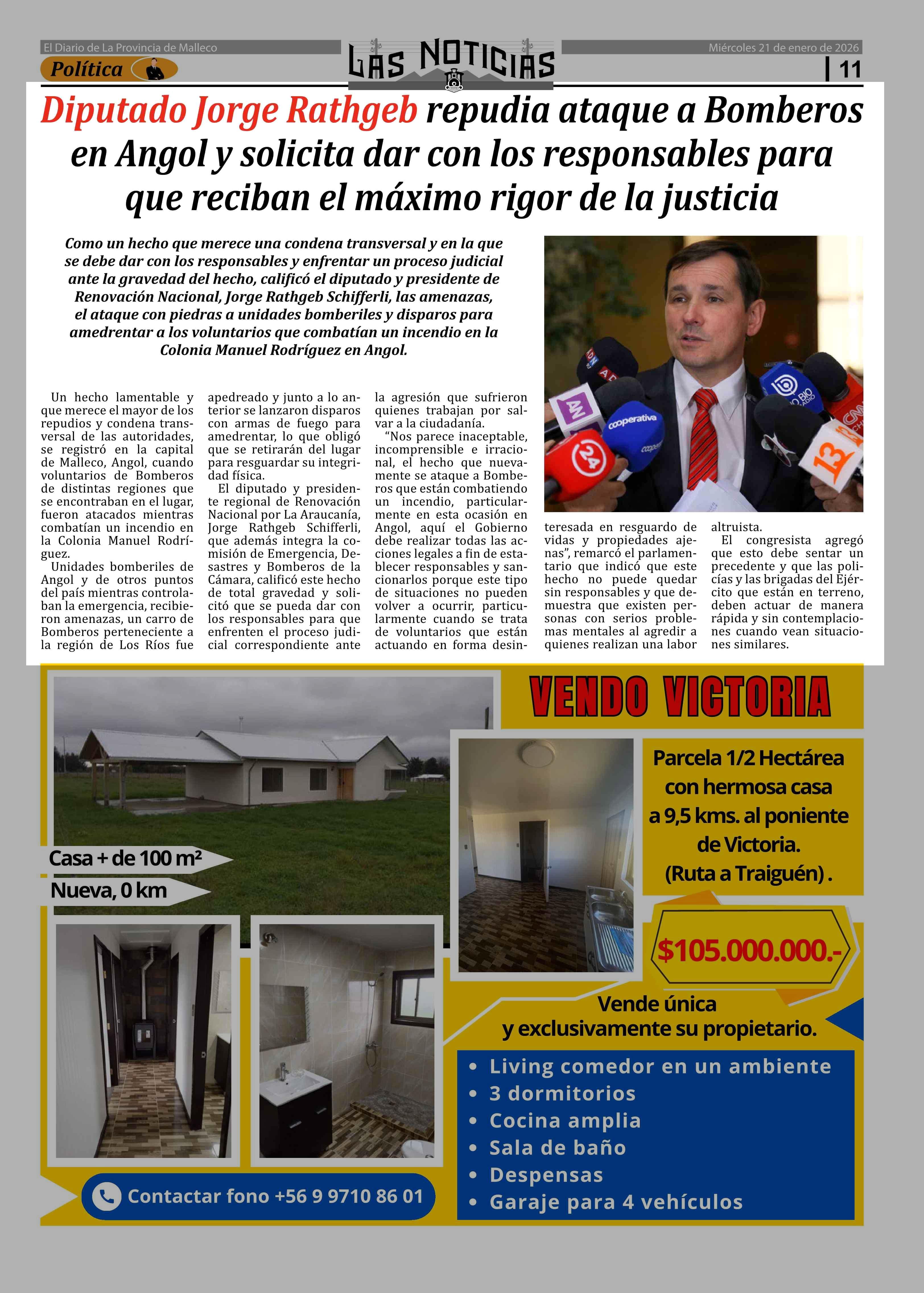 Diputado Jorge Rathgeb repudia ataque a Bomberos en Angol y solicita dar con los responsables para que reciban el máximo rigor de la justicia 21-01-2026 Las Noticias |
