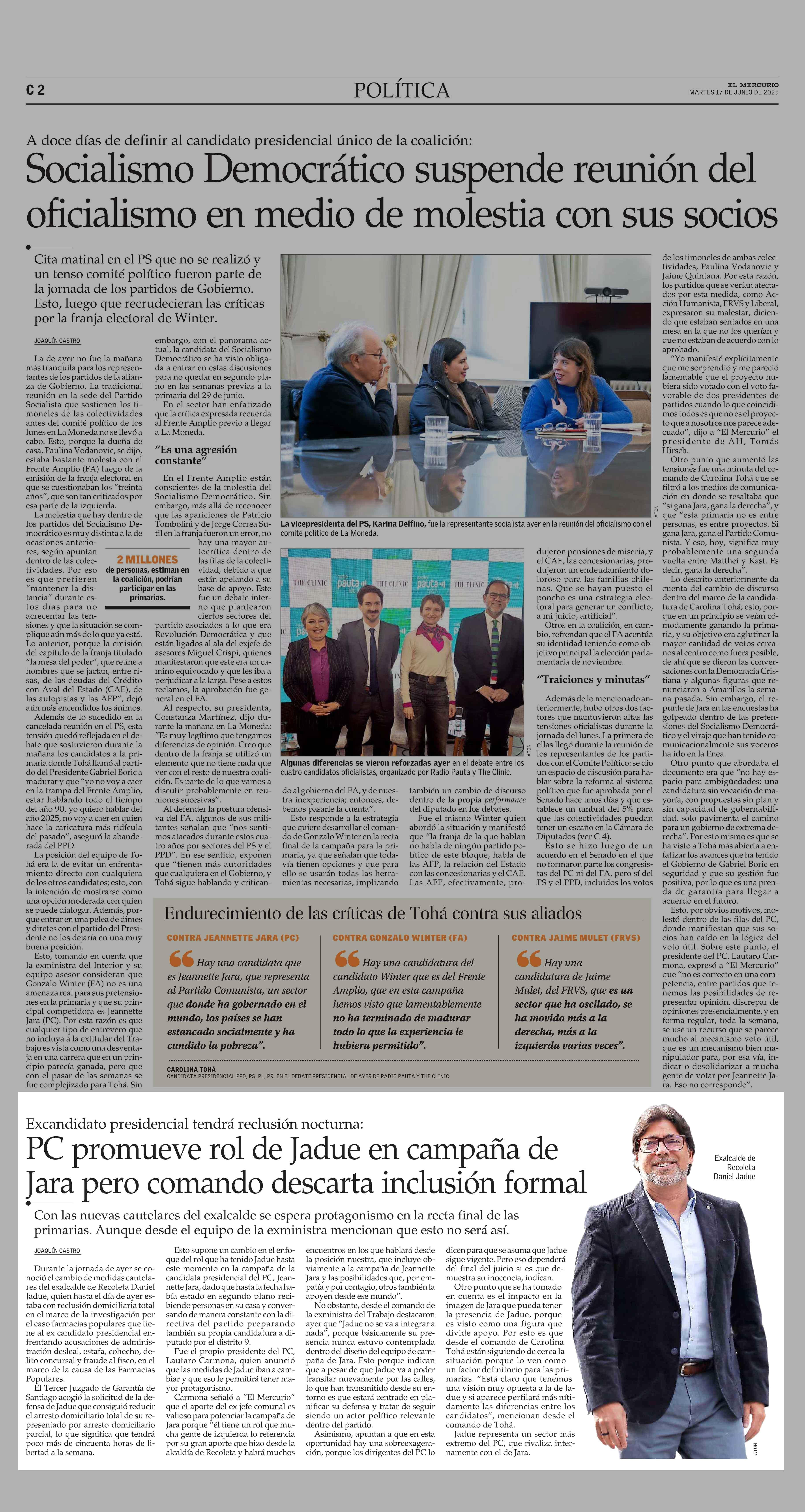 PC promueve rol de Jadue en campaña de Jara pero comando descarta inclusión formal 17-06-2025 El Mercurio |