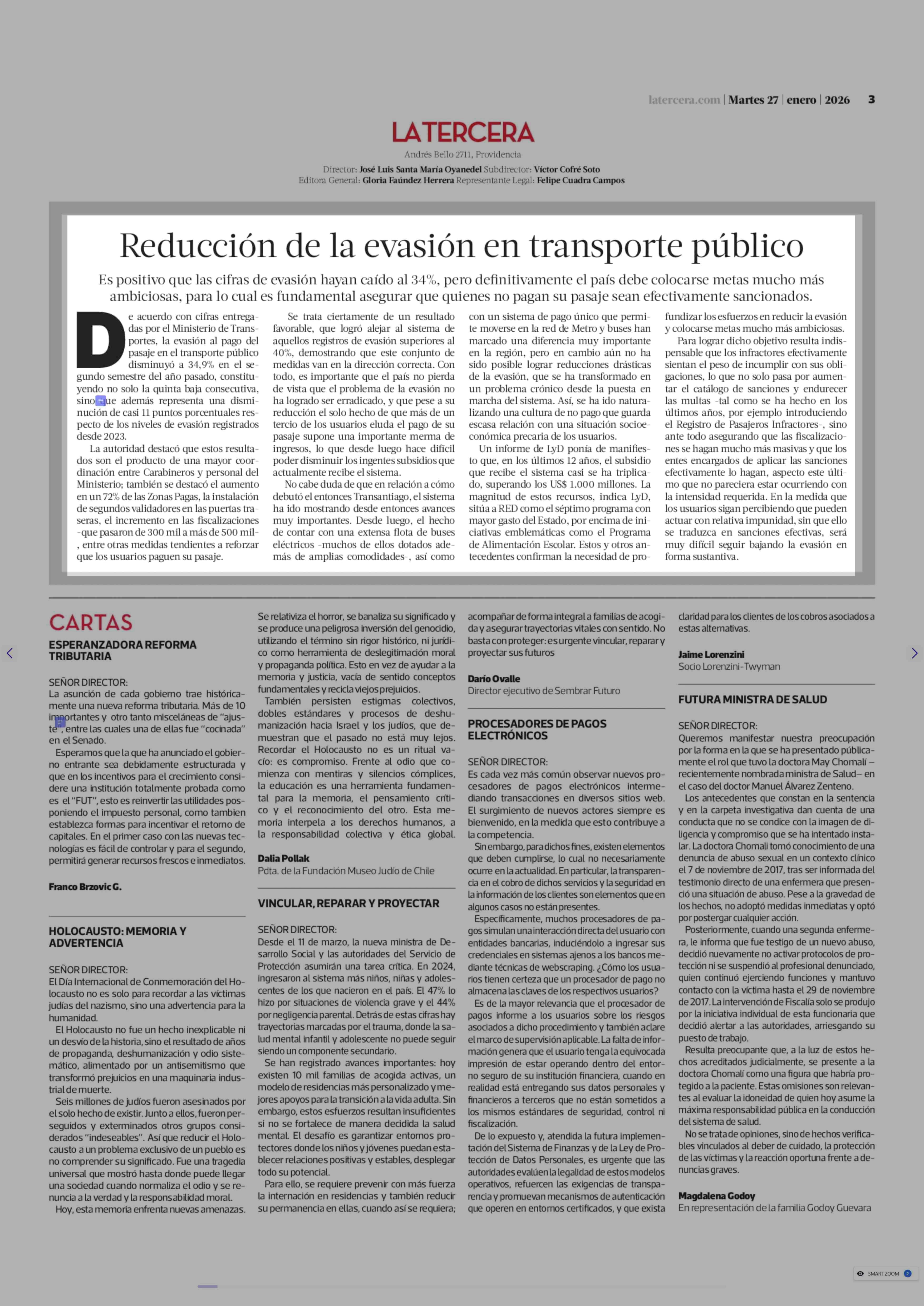 EDITORIAL: Reducción de la evasión en transporte público 27-01-2026 La Tercera |