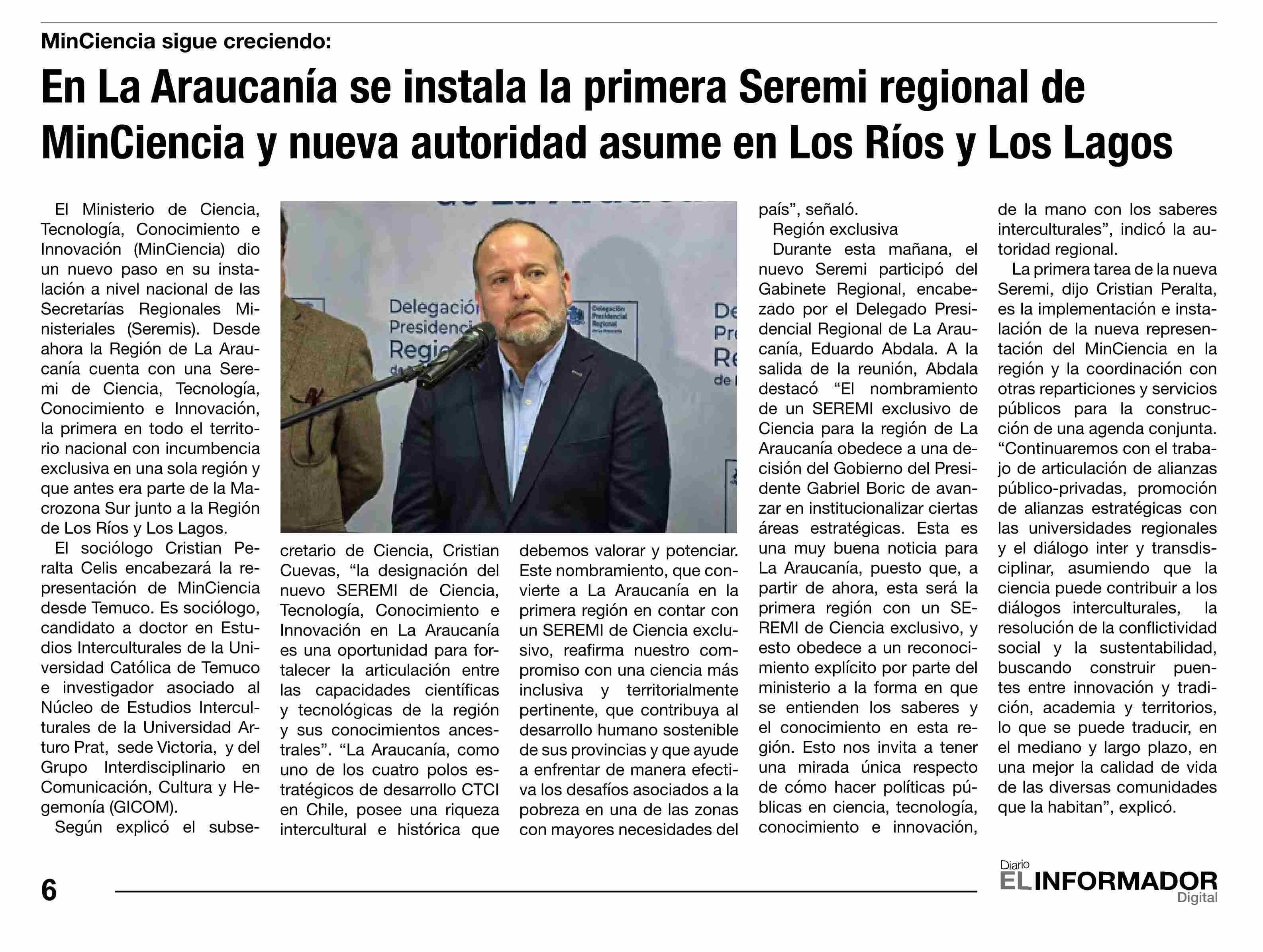 En La Araucanía se instala la primera Seremi regional de MinCiencia y nueva autoridad asume en Los Ríos y Los Lagos 04-06-2025 El Informador |