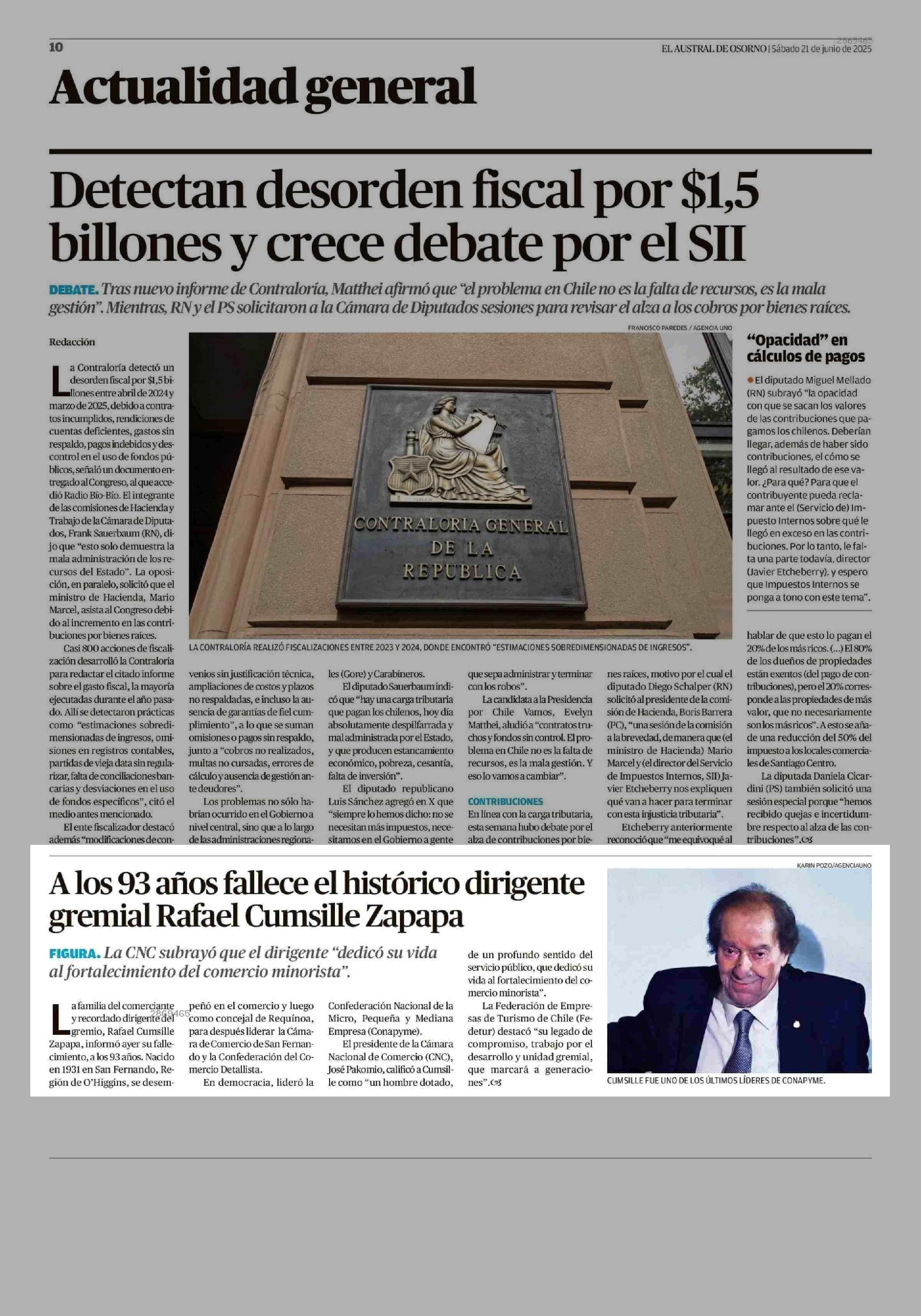 A los 93 años fallece el histórico dirigente gremial Rafael Cumsille Zapapa 21-06-2025 El Austral de Osorno |