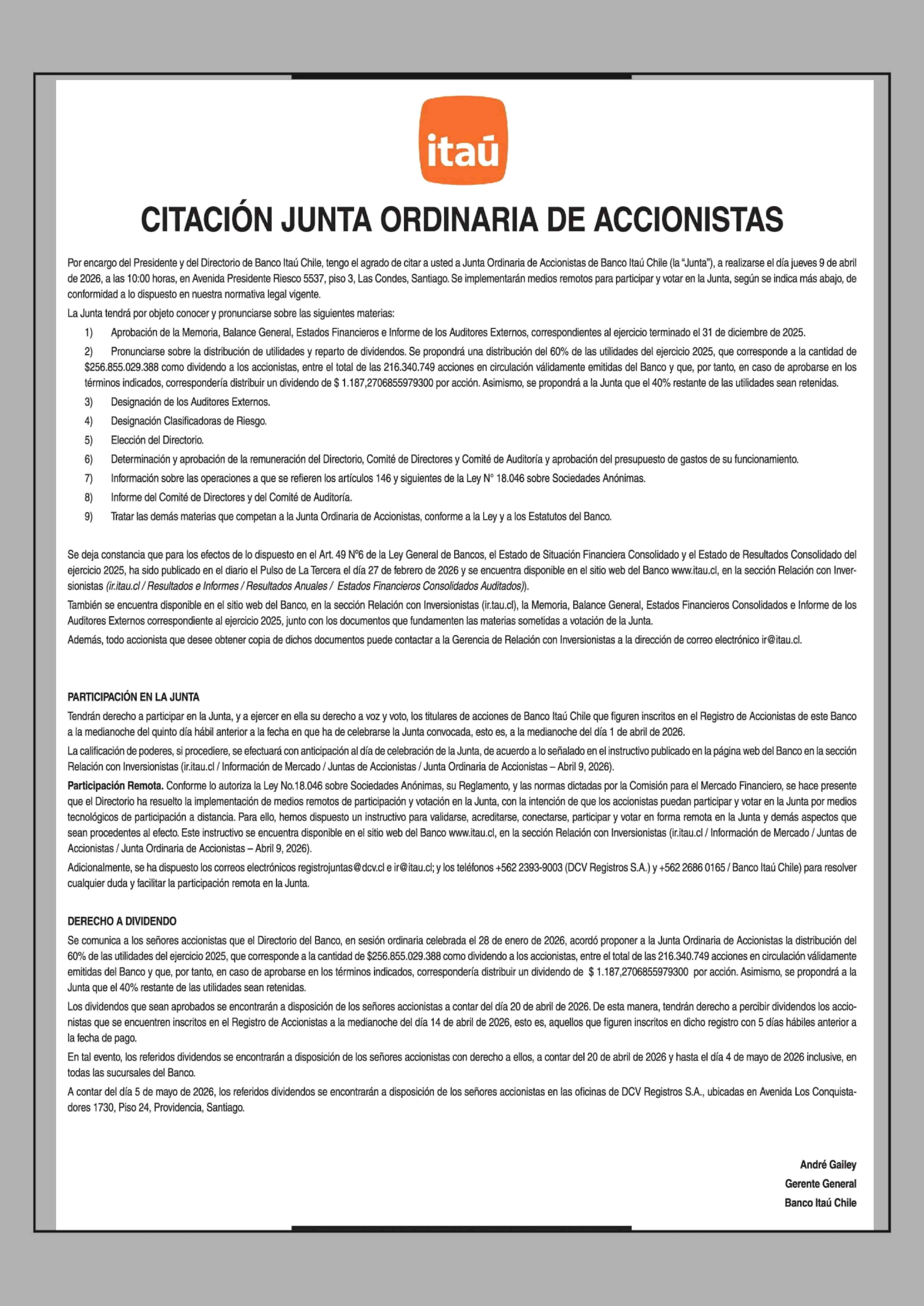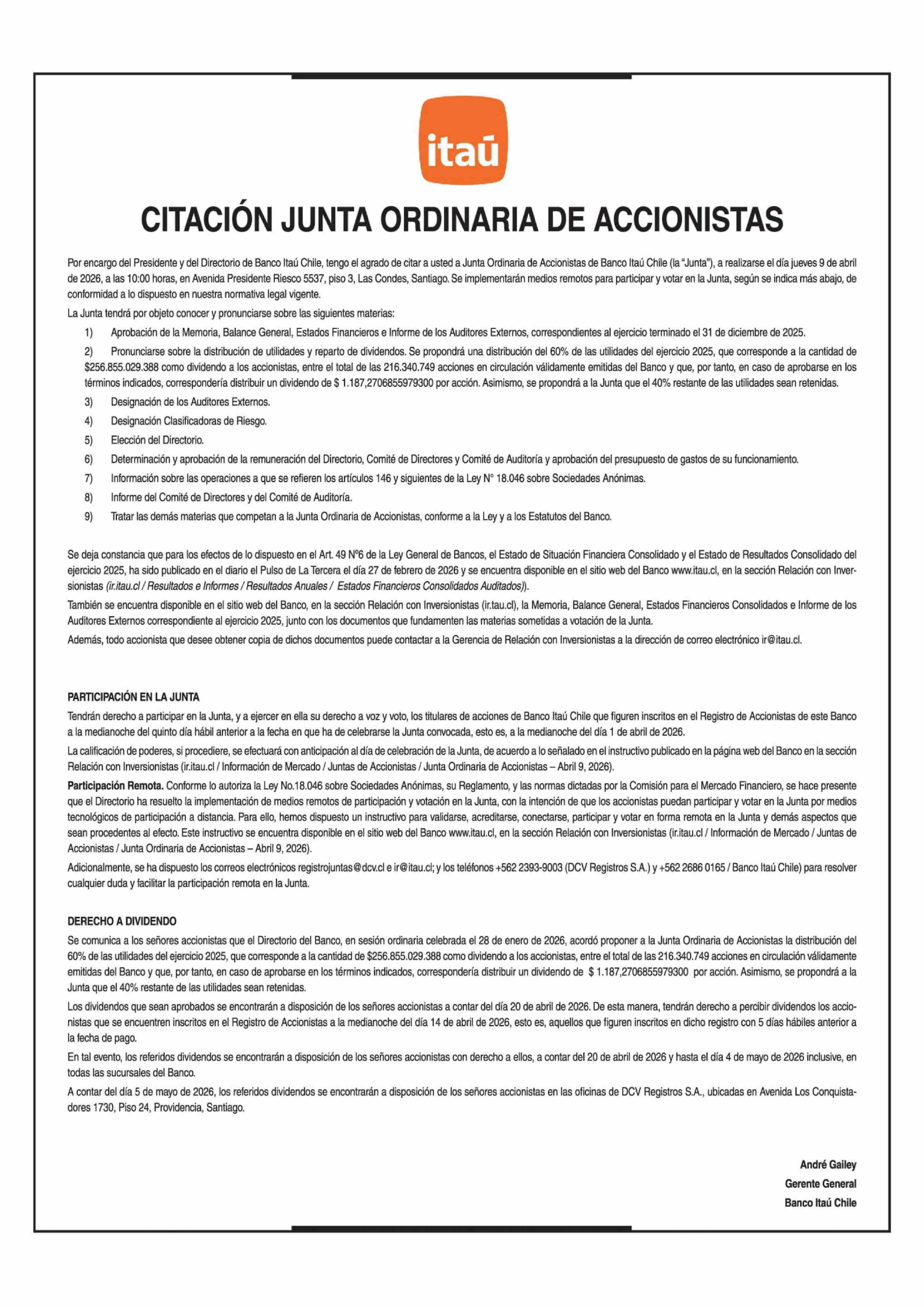 Extractos: CITACIÓN JUNTA ORDINARIA DE ACCIONISTAS ITAÚ 25-03-2026 La Tercera |