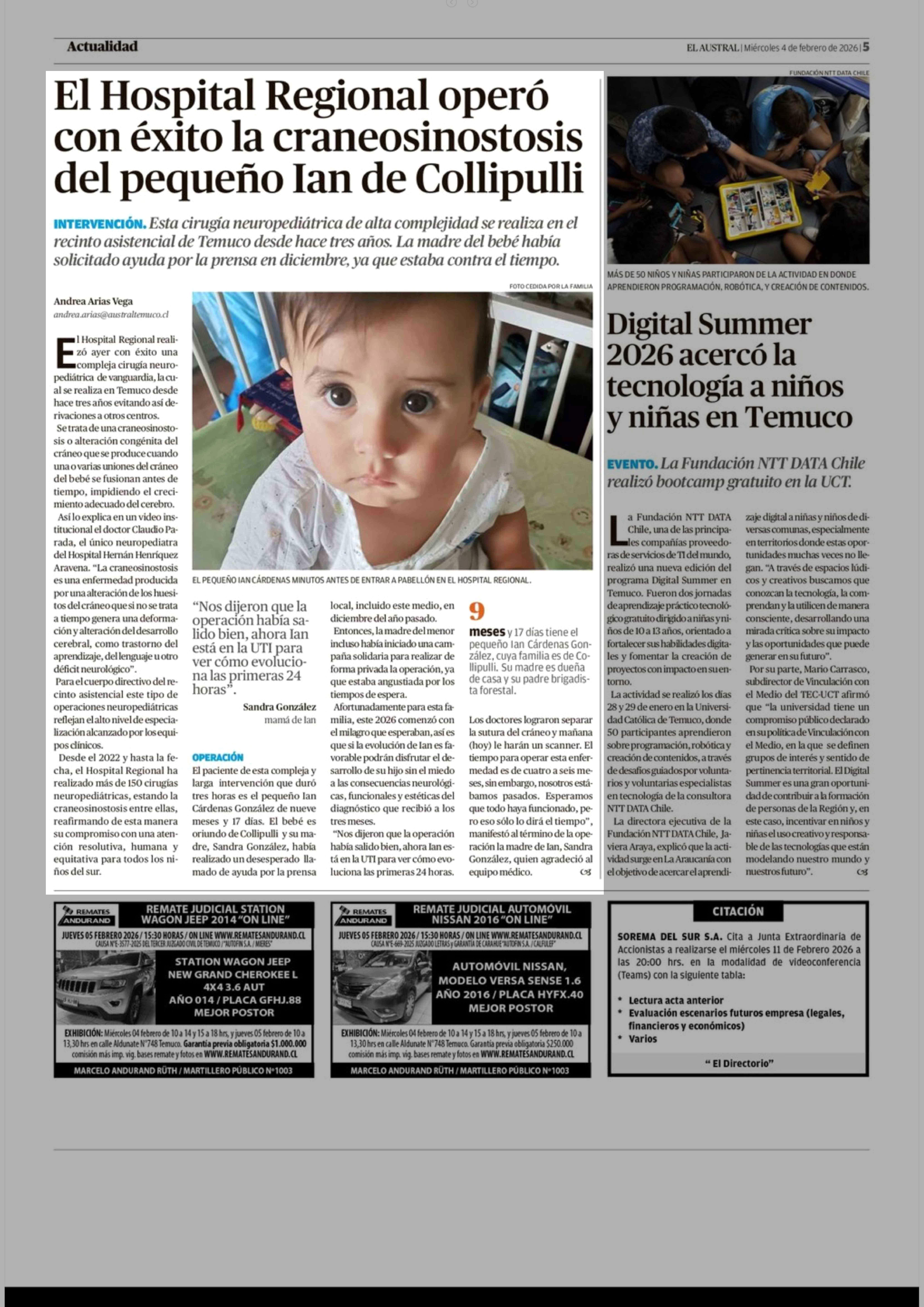 El Hospital Regional operó con éxito la craneosinostosis del pequeño Ian de Collipulli 04-02-2026 El Austral de la Araucanía |