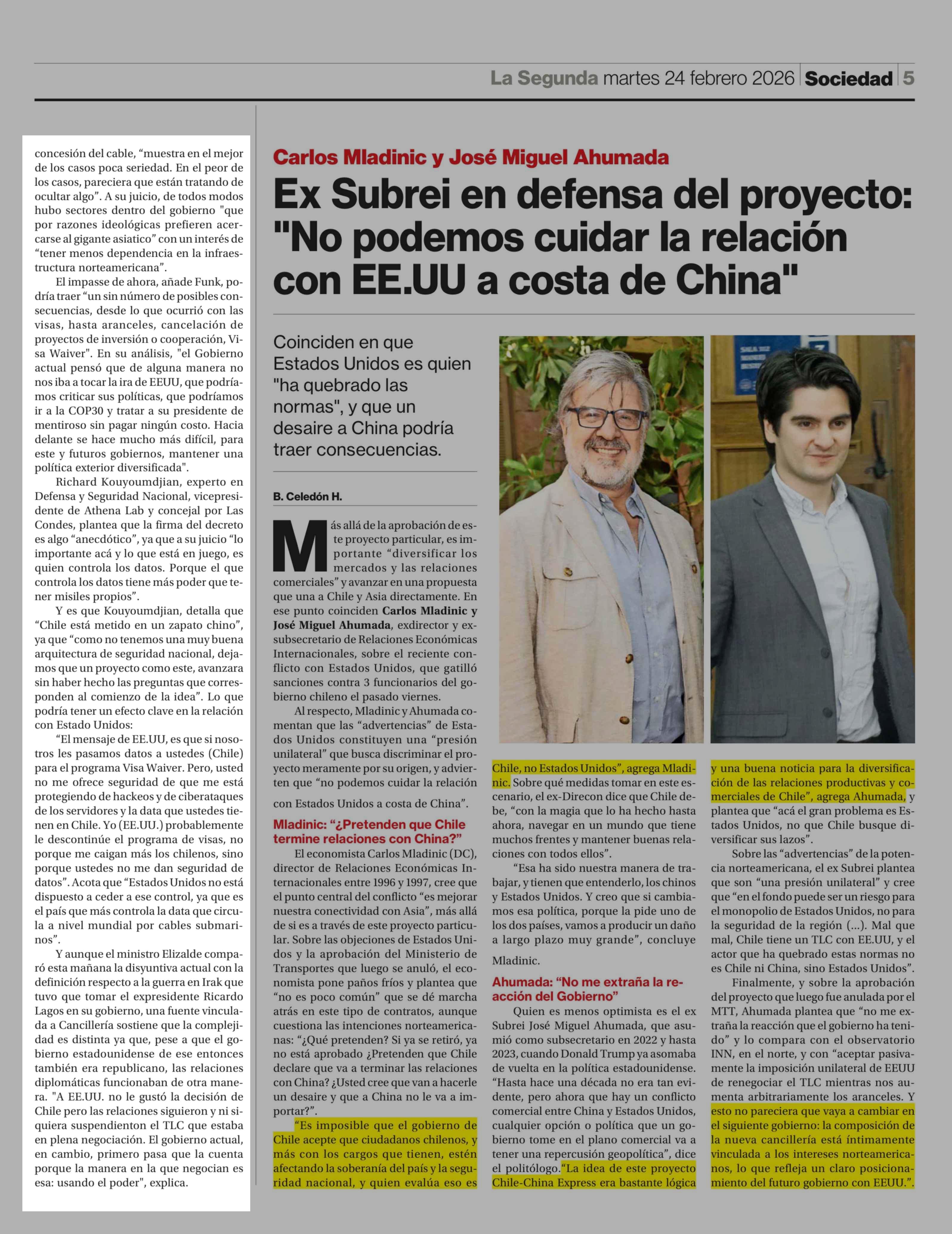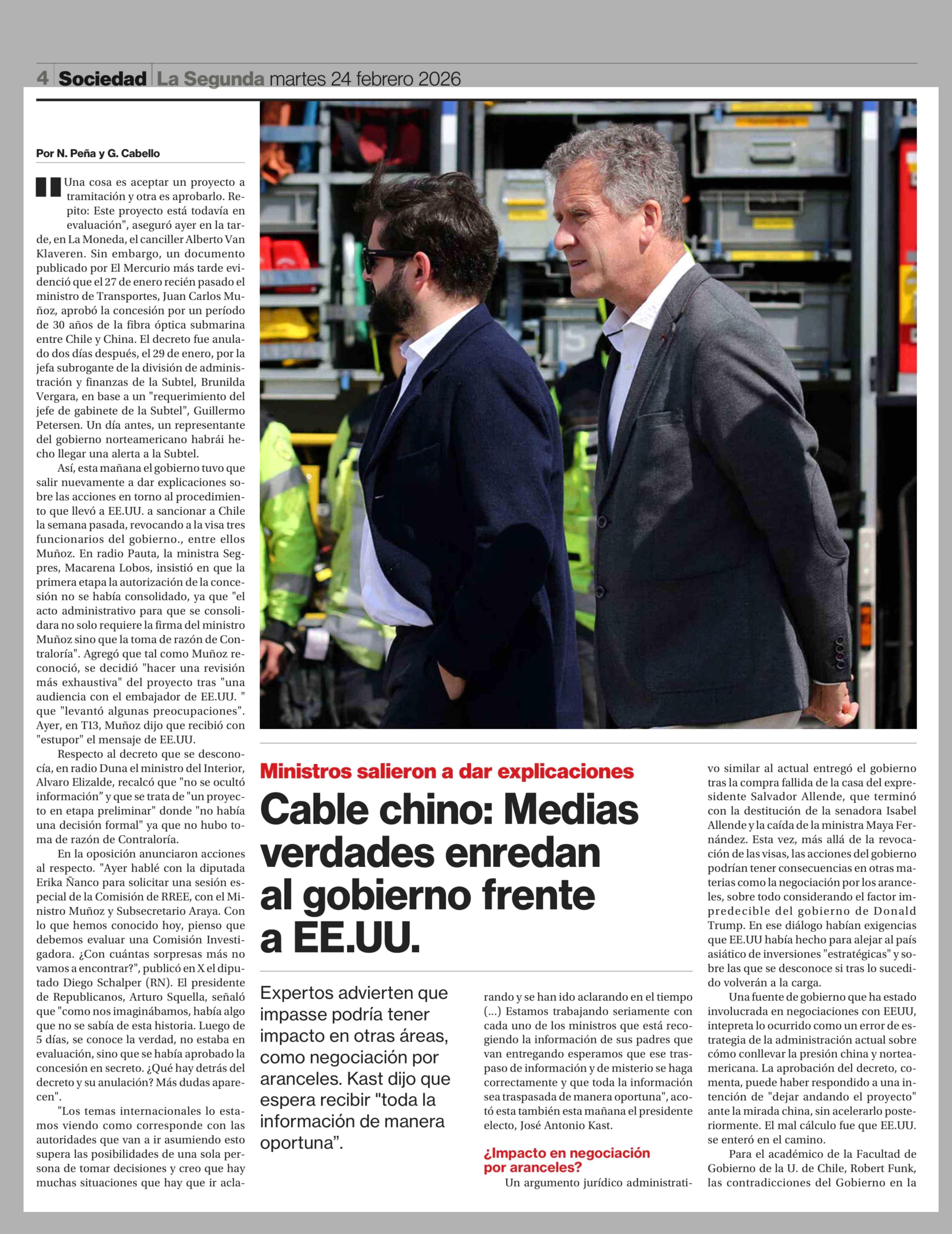 Cable chino: Medias verdades enredan al gobierno frente a EE.UU. 24-02-2026 La Segunda |