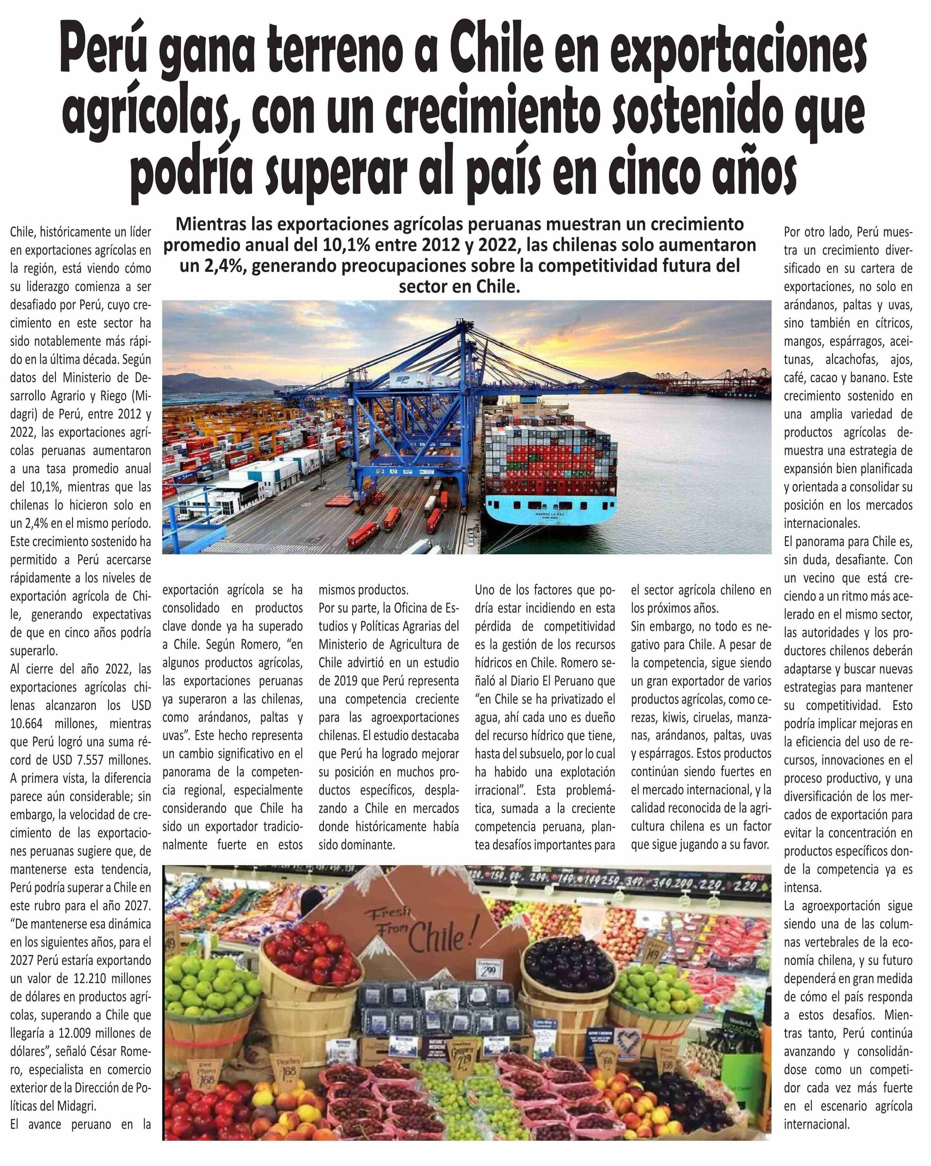 Perú gana terreno a Chile en exportaciones agrícolas, con un crecimiento sostenido que podría superar al país en cinco años 02-09-2024 El Longino |