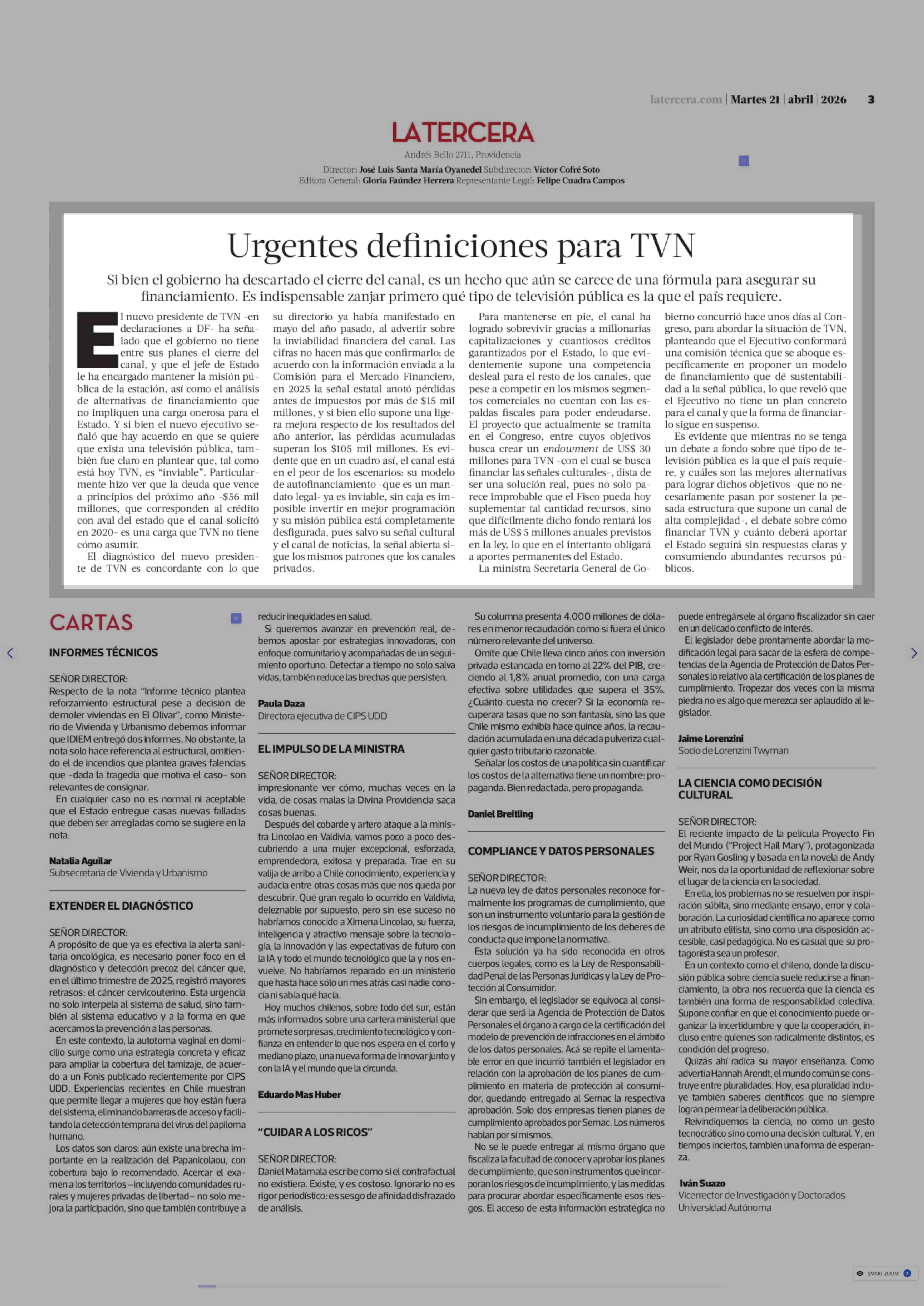 EDITORIAL: Urgentes definiciones para TVN 21-04-2026 La Tercera |