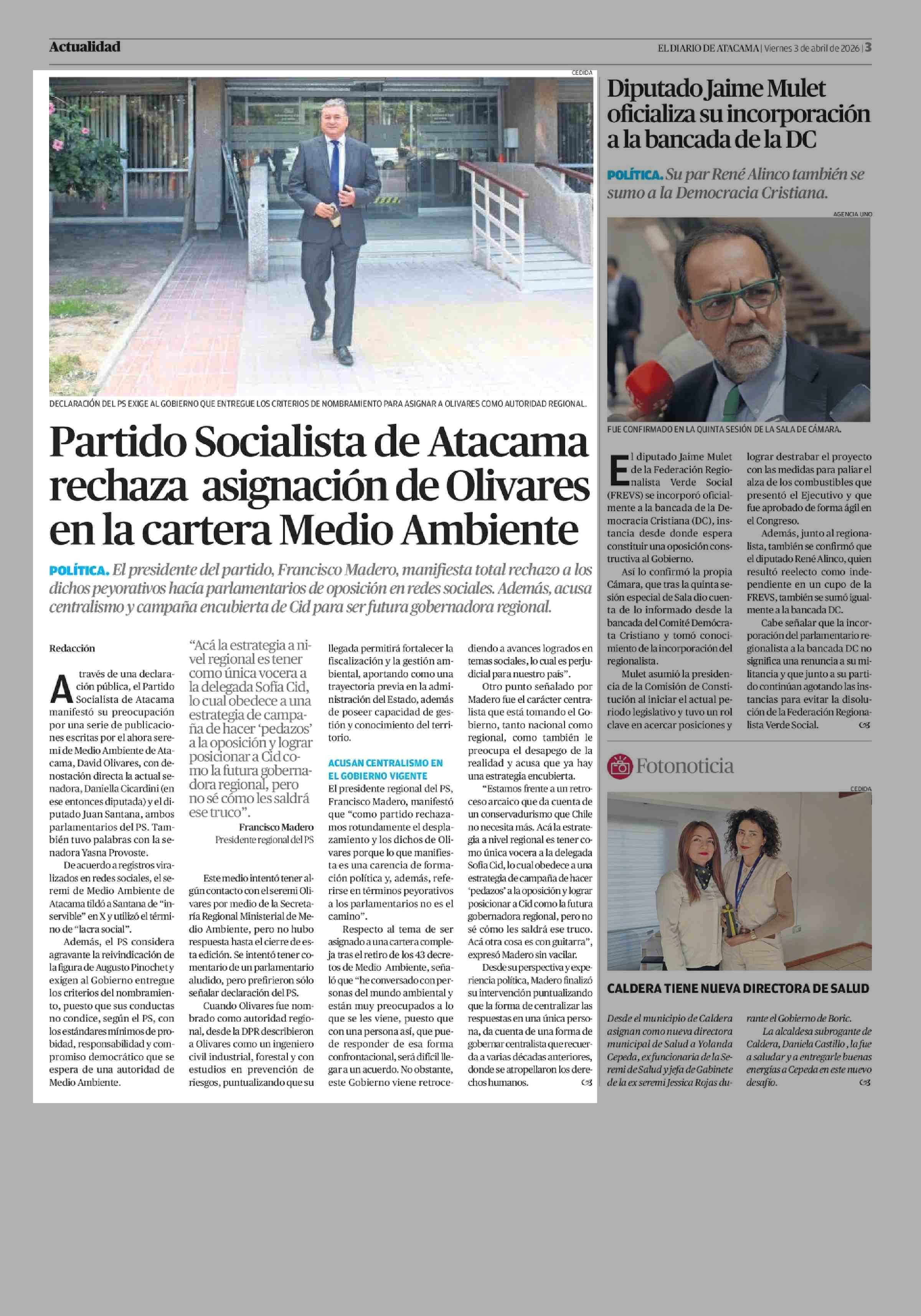Título: Partido Socialista de Atacama rechaza asignación de Olivares en la cartera Medio Ambiente