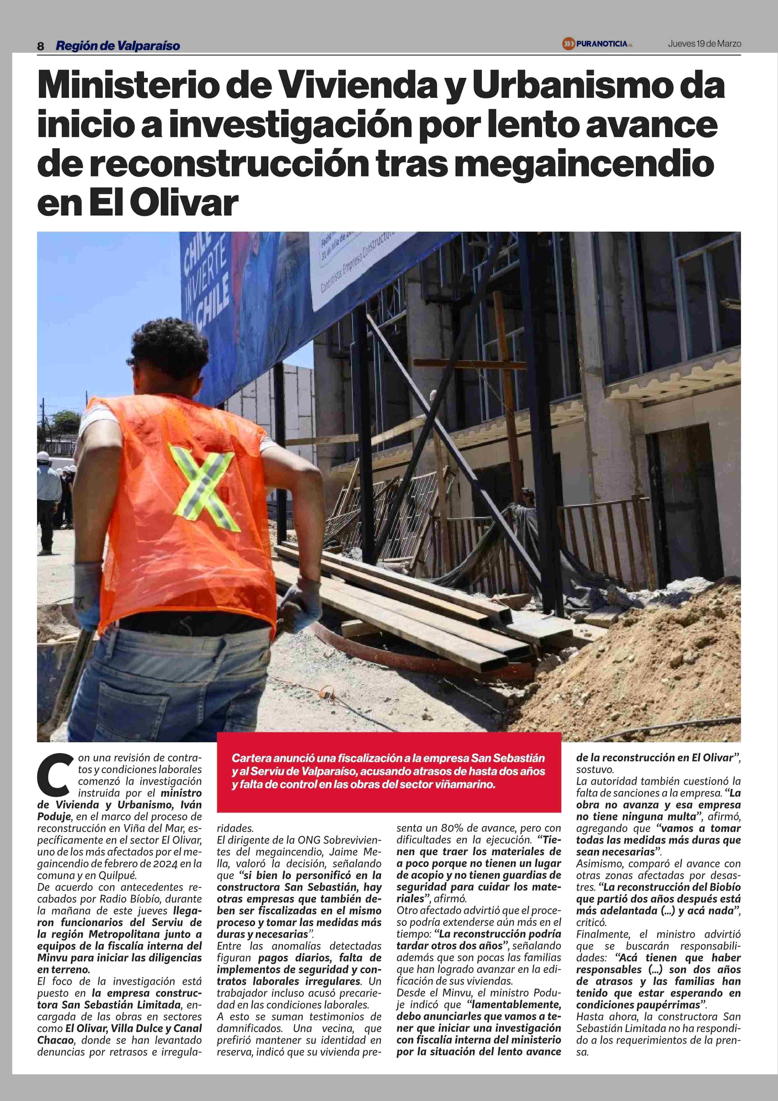 Ministerio de Vivienda y Urbanismo da inicio a investigación por lento avance de reconstrucción tras megaincendio en El Olivar 19-03-2026 Puranoticia.cl |