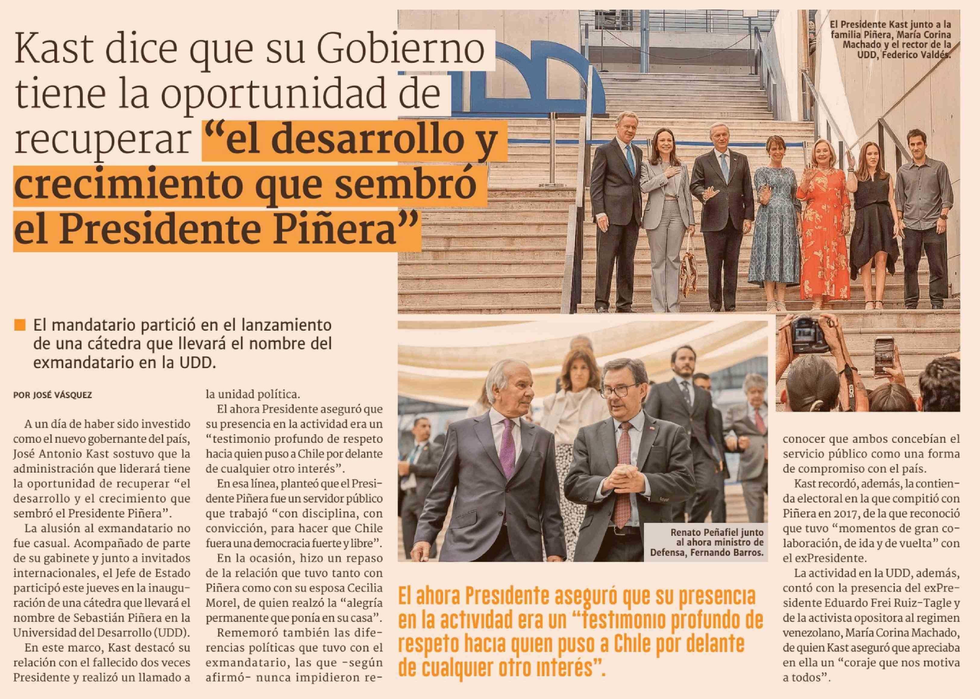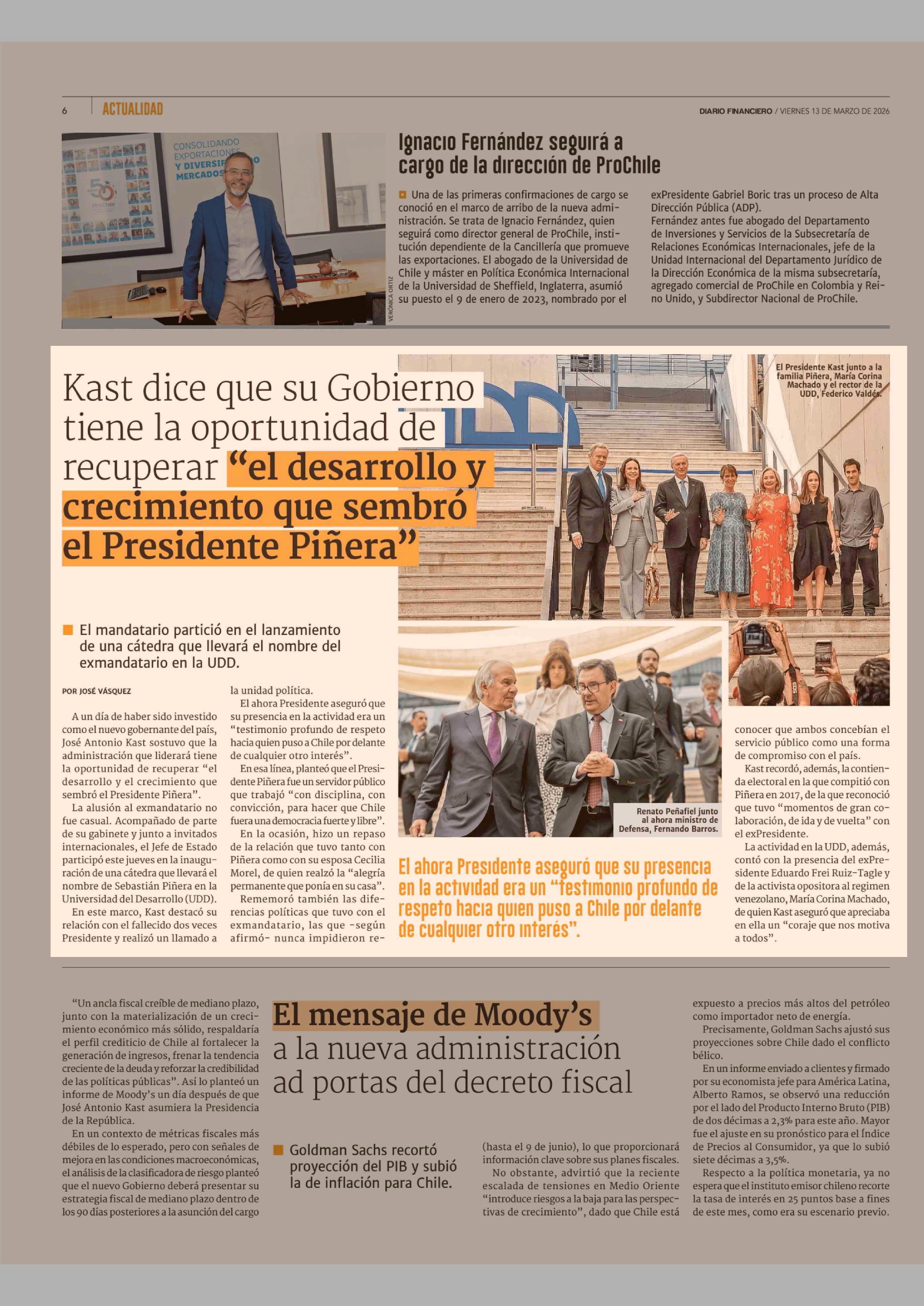 Kast dice que su Gobierno tiene la oportunidad de recuperar "el desarrollo y crecimiento que sembró el Presidente Piñera' 13-03-2026 Diario Financiero |