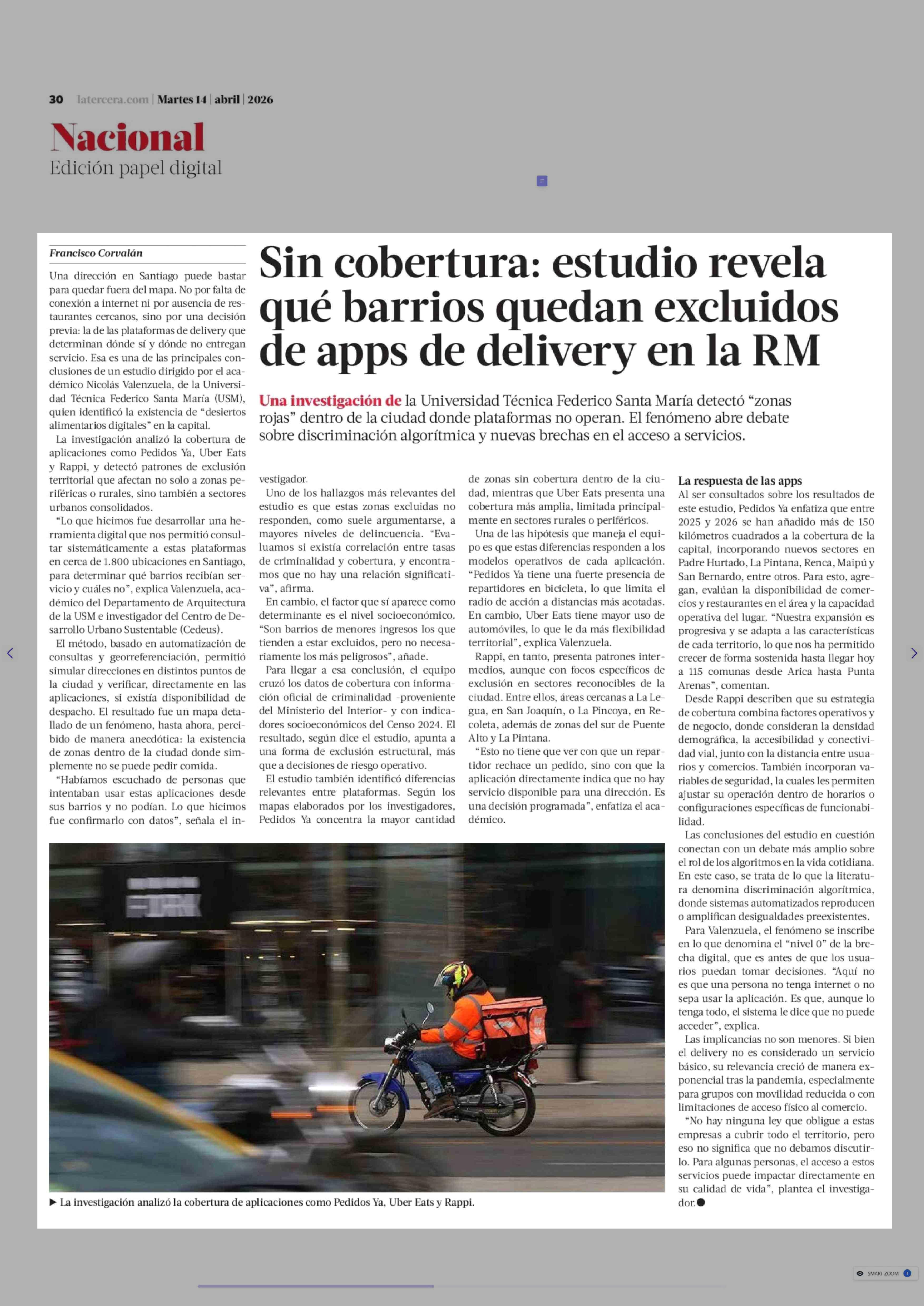 Sin cobertura: estudio revela qué barrios quedan excluidos de apps de delivery en la RM 14-04-2026 La Tercera |