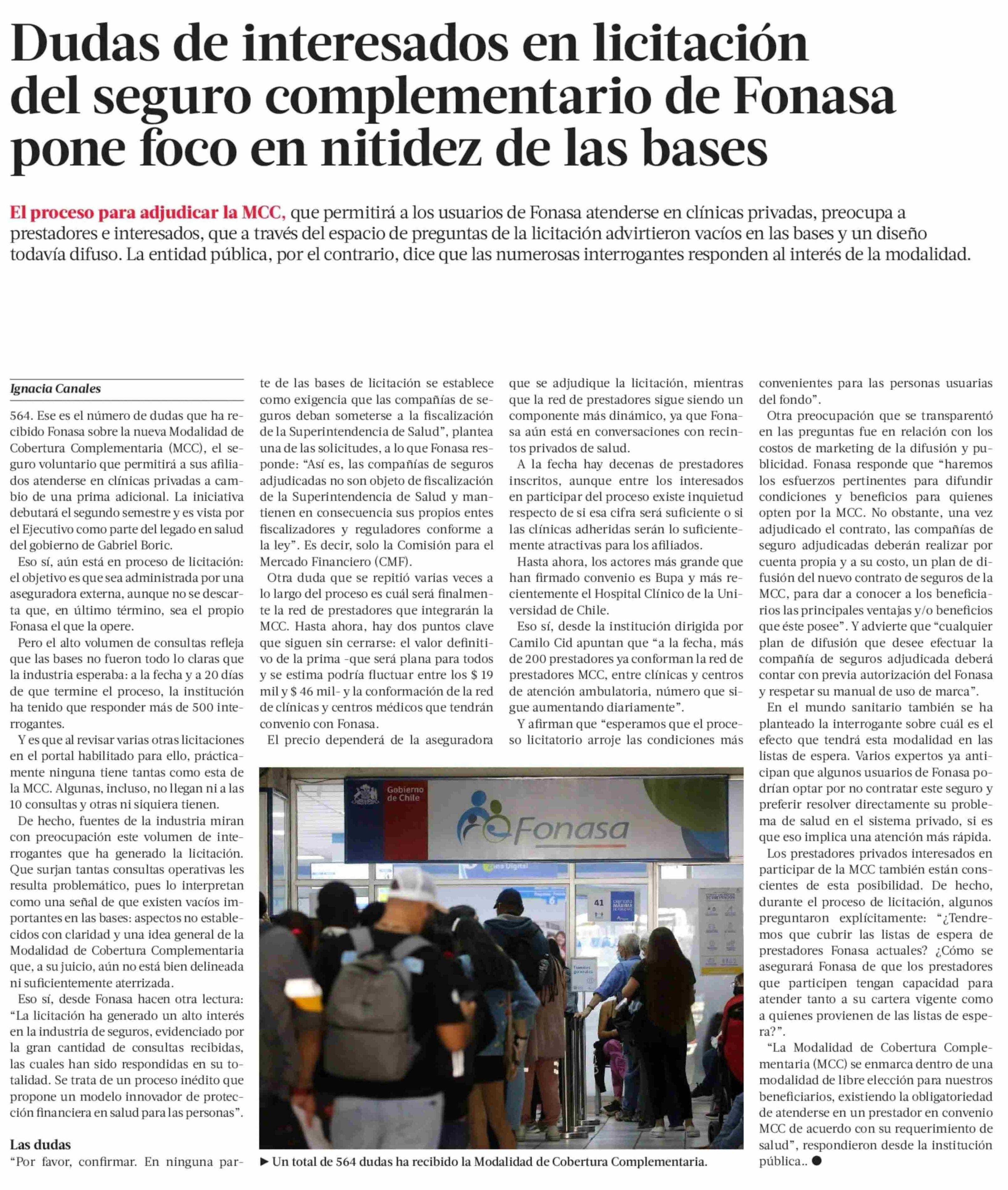 | Título: | Dudas de interesados en licitación del seguro complementario de Fonasa pone foco en nitidez de las bases |