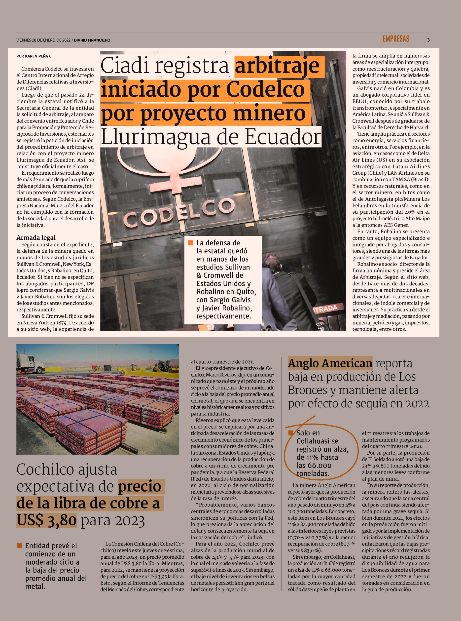 Título: Ciadi registra arbitraje iniciado por Codelco por proyecto minero, Llurimagua de Ecuador
