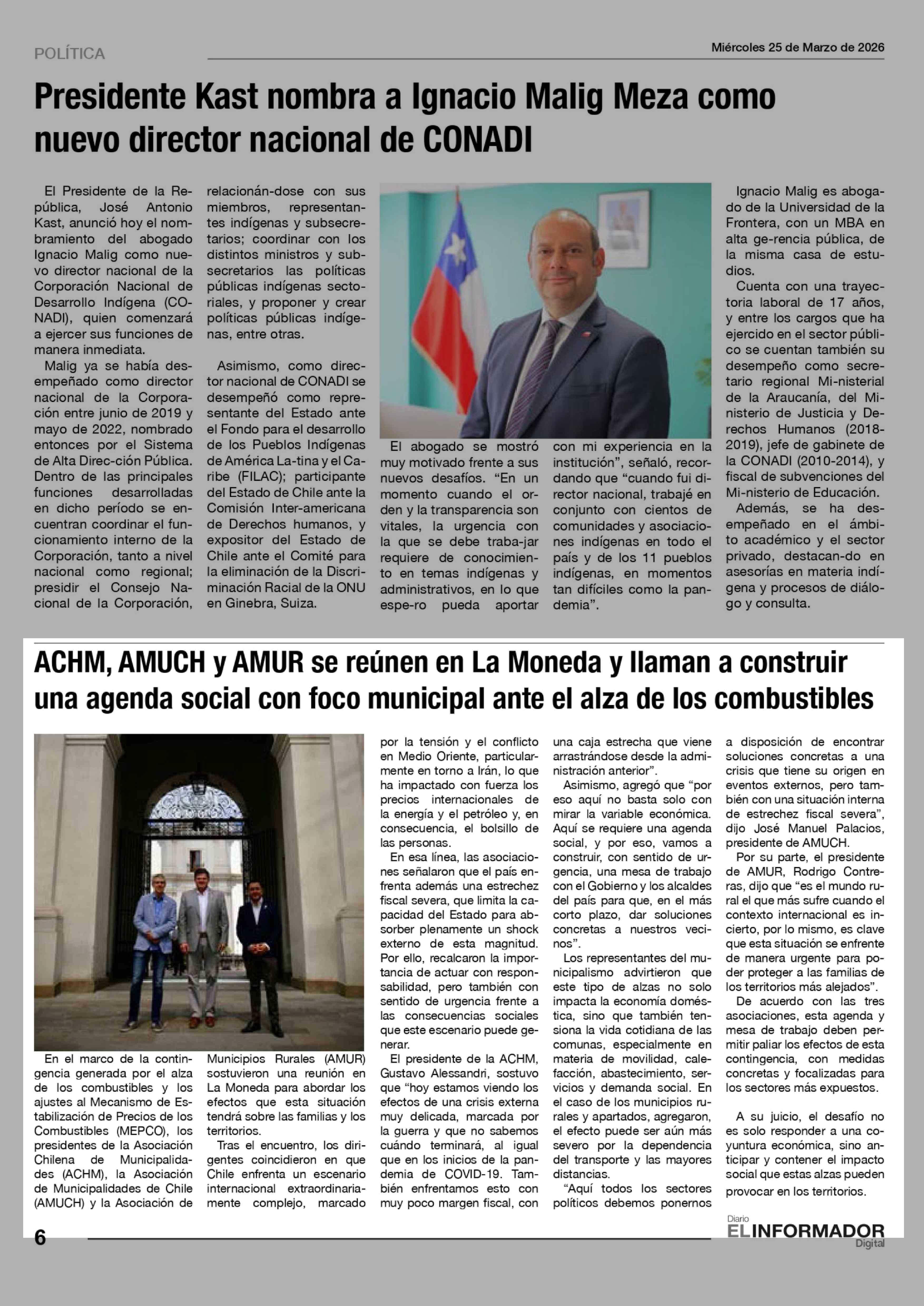 Título: ACHM, AMUCH y AMUR se reúnen en La Moneda y llaman a construir una agenda social con foco municipal ante el alza de los combustibles