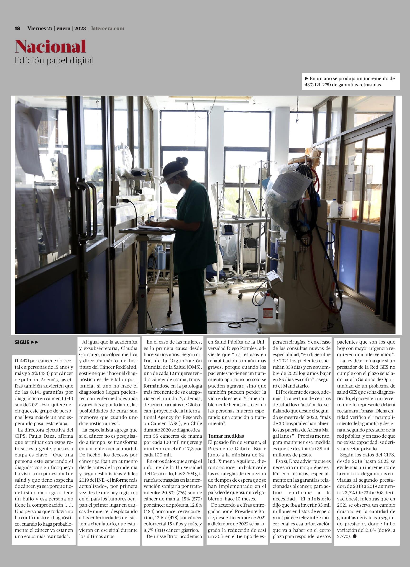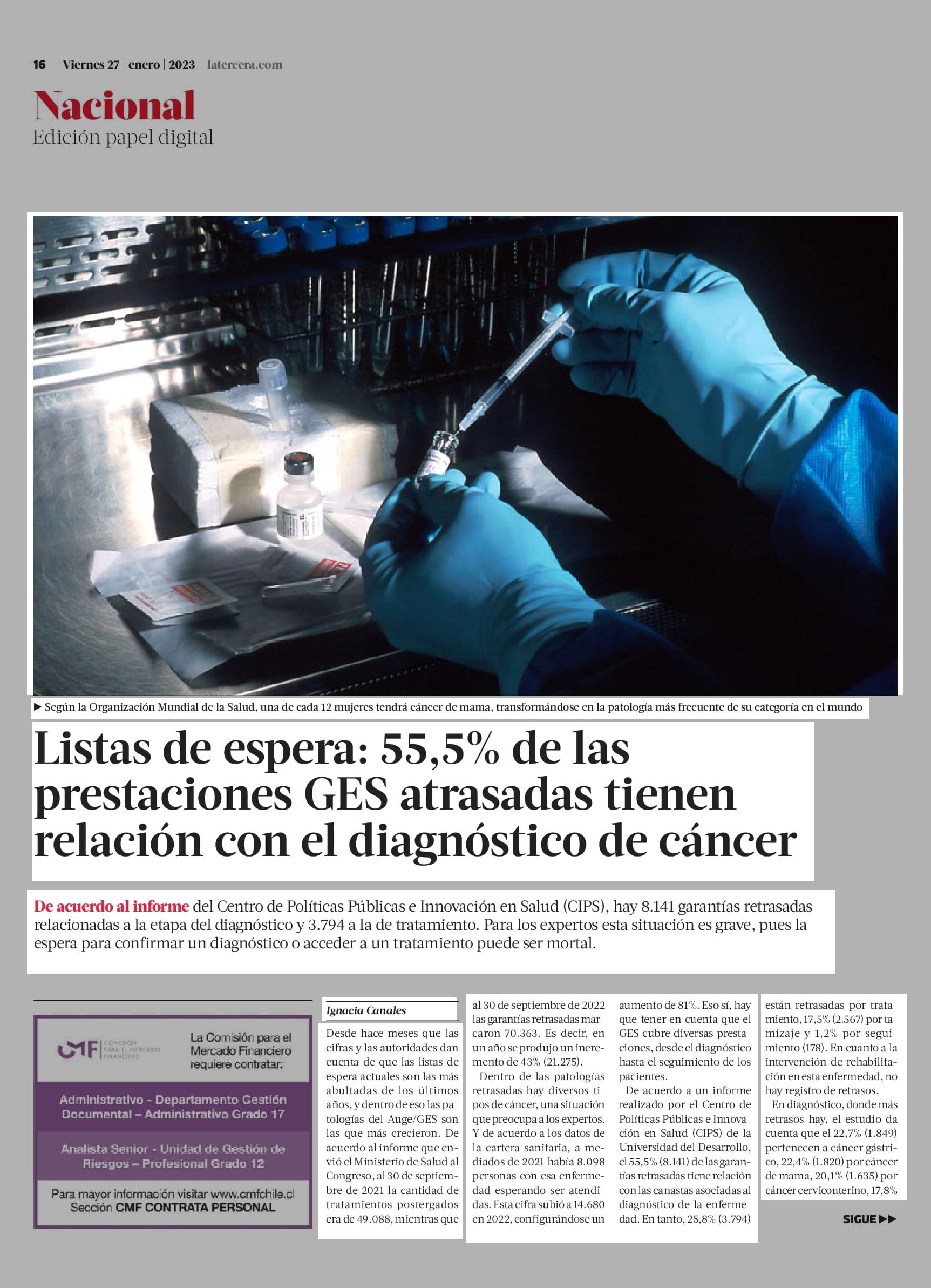 Título: Listas de espera: 55,5 % de las prestaciones GES atrasadas tienen relación con el diagnóstico de cáncer